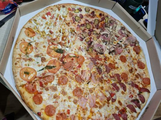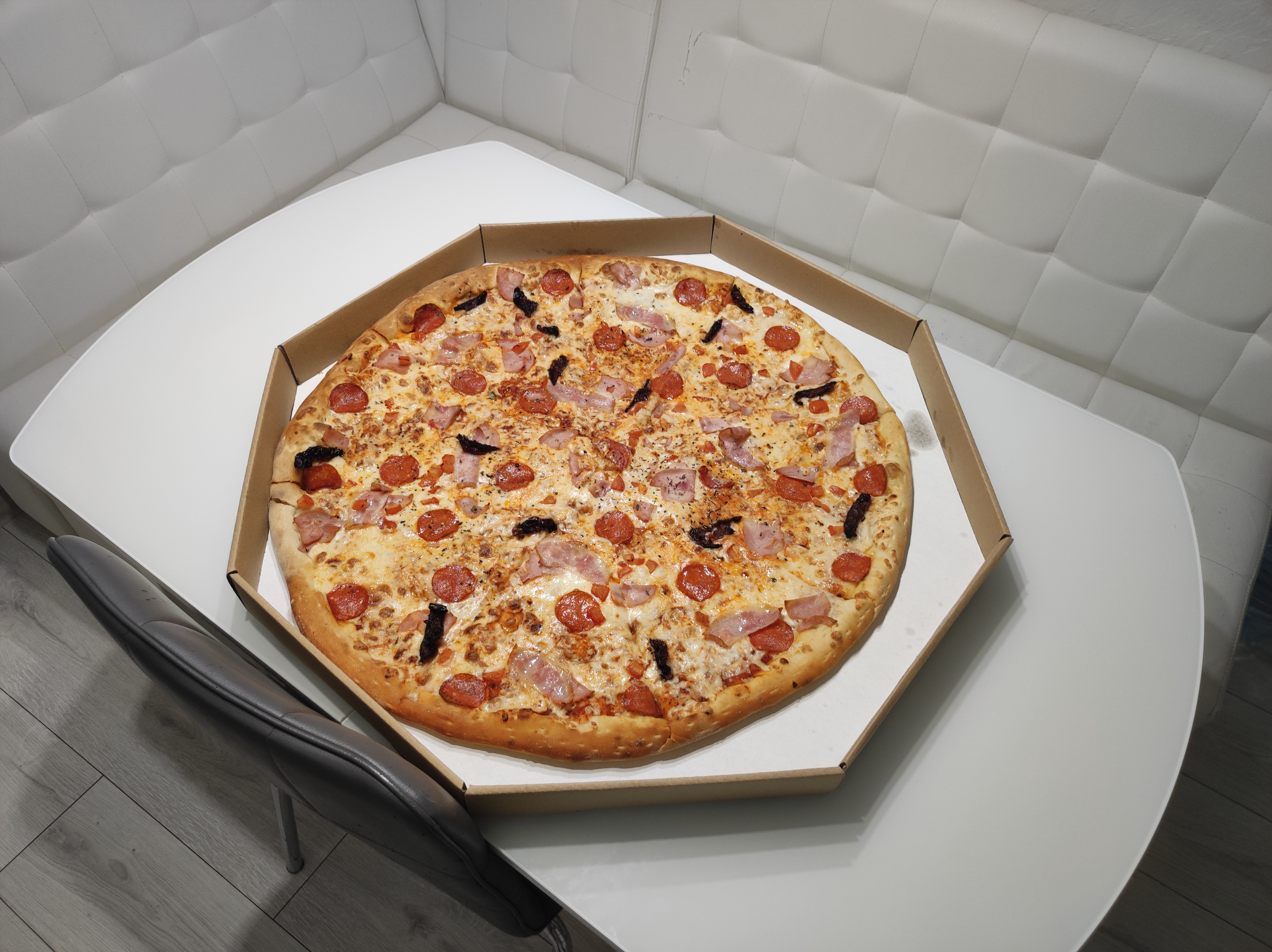 - мега-пицца "Компанейская" (60 см, 2000 г): моцарелла, пицца-соус, помидор, ветчина куриная, пепперони, бекон, лук маринованный, колбаски охотничьи, огурцы маринованные