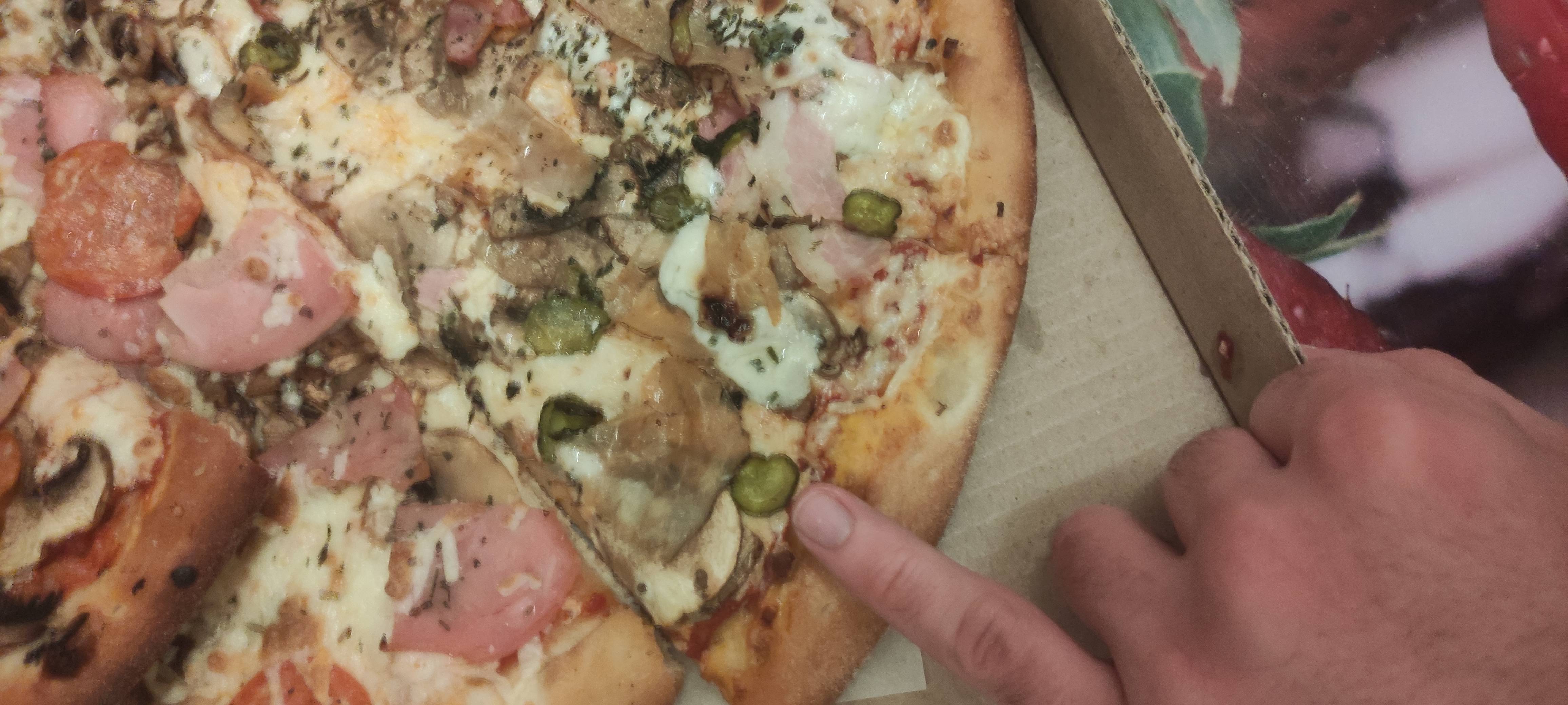 Заказывали пиццу деревенскую. Заказывали ради огурцов, по итогу что на фото/ по факту. Подставил мезинец для сравнения. Не совсем всё печально, но заказывать больше не будем