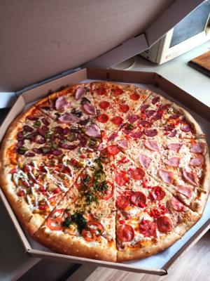 Сегодня заказывали пиццу 8 ломтиков, привезли вовремя, ещё тёплую, по скидке можно попробовать, но по полной стоимости оно того не стоит.