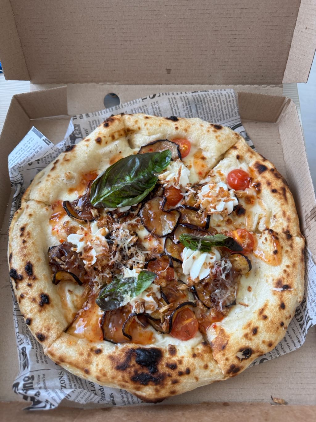 Состав: бешамель, баклажаны, томаты черри, крем чиз, криспи-лук, сладкий чили, базилик, пармезан