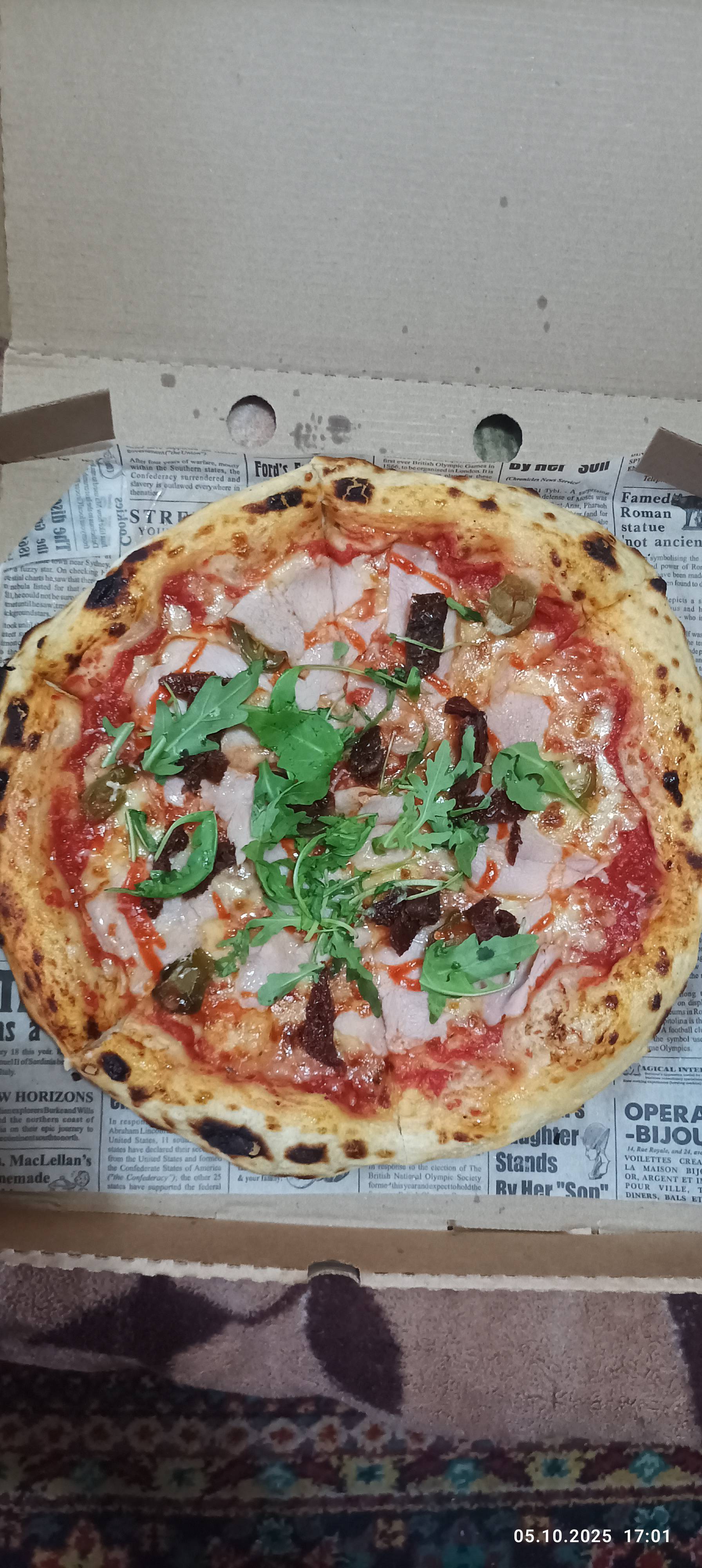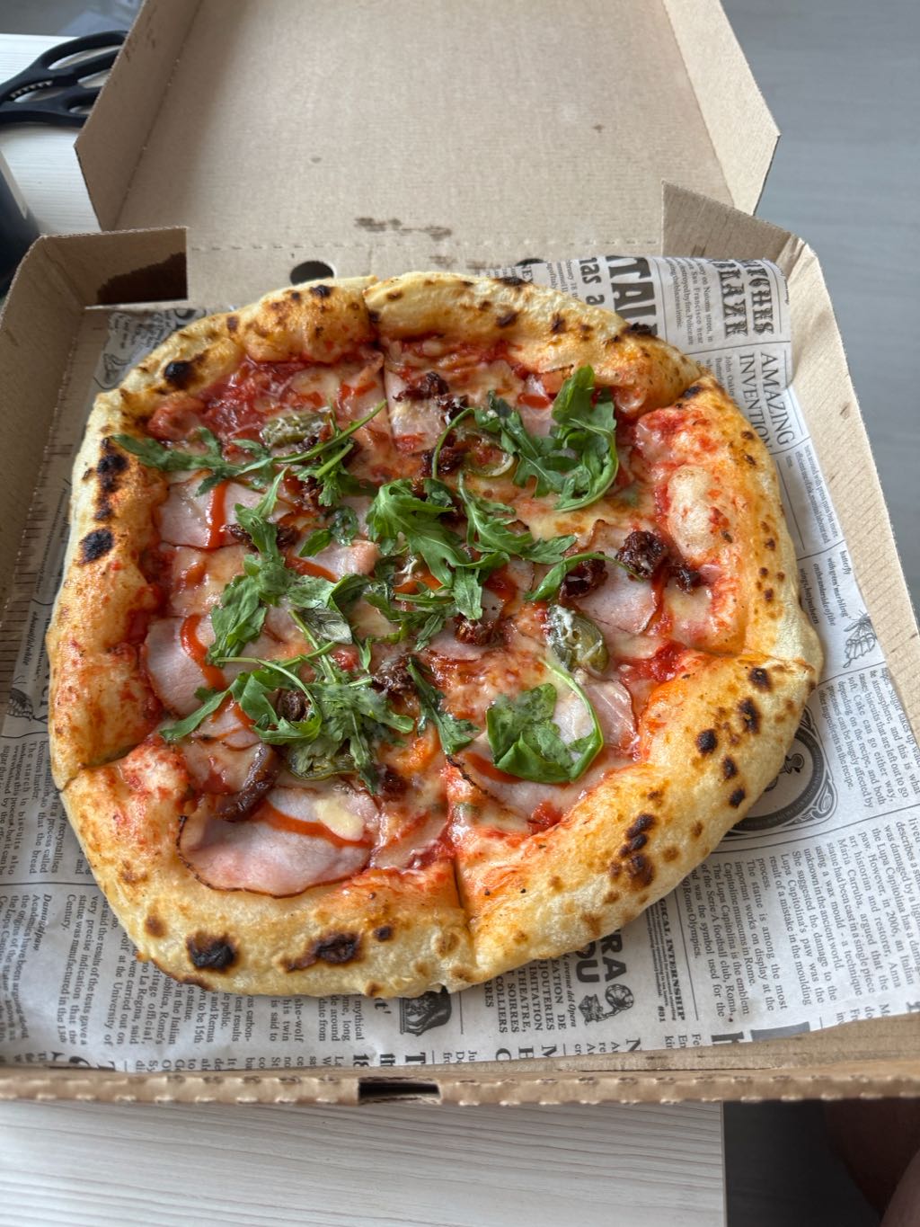Состав: красный соус, полендвица, перец халапеньо, вяленые томаты, соус шри-рача, руккола, орегано, пармезан