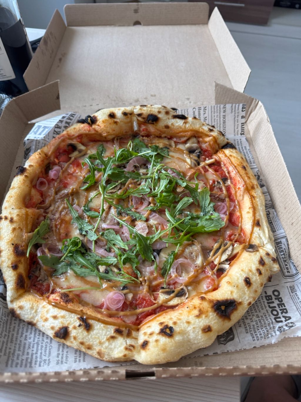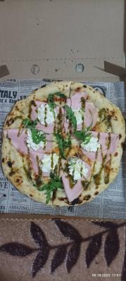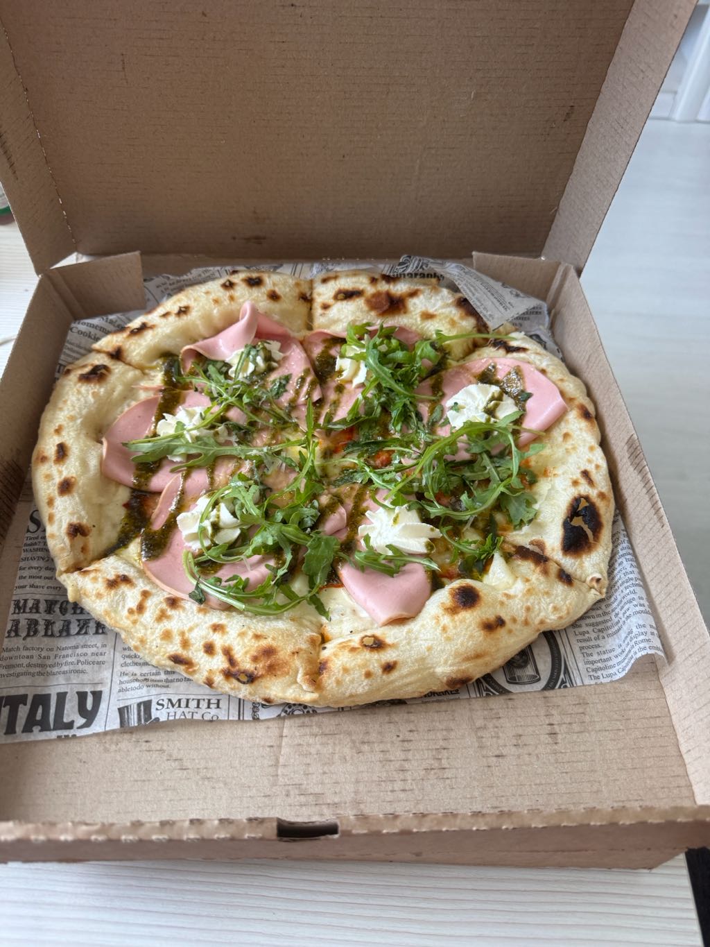 Состав: бешамель, мортаделла, рикотта, фисташковое песто, соус кимчи, руккола, пармезан
