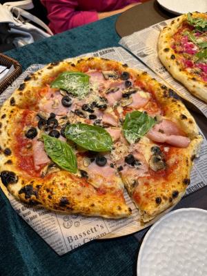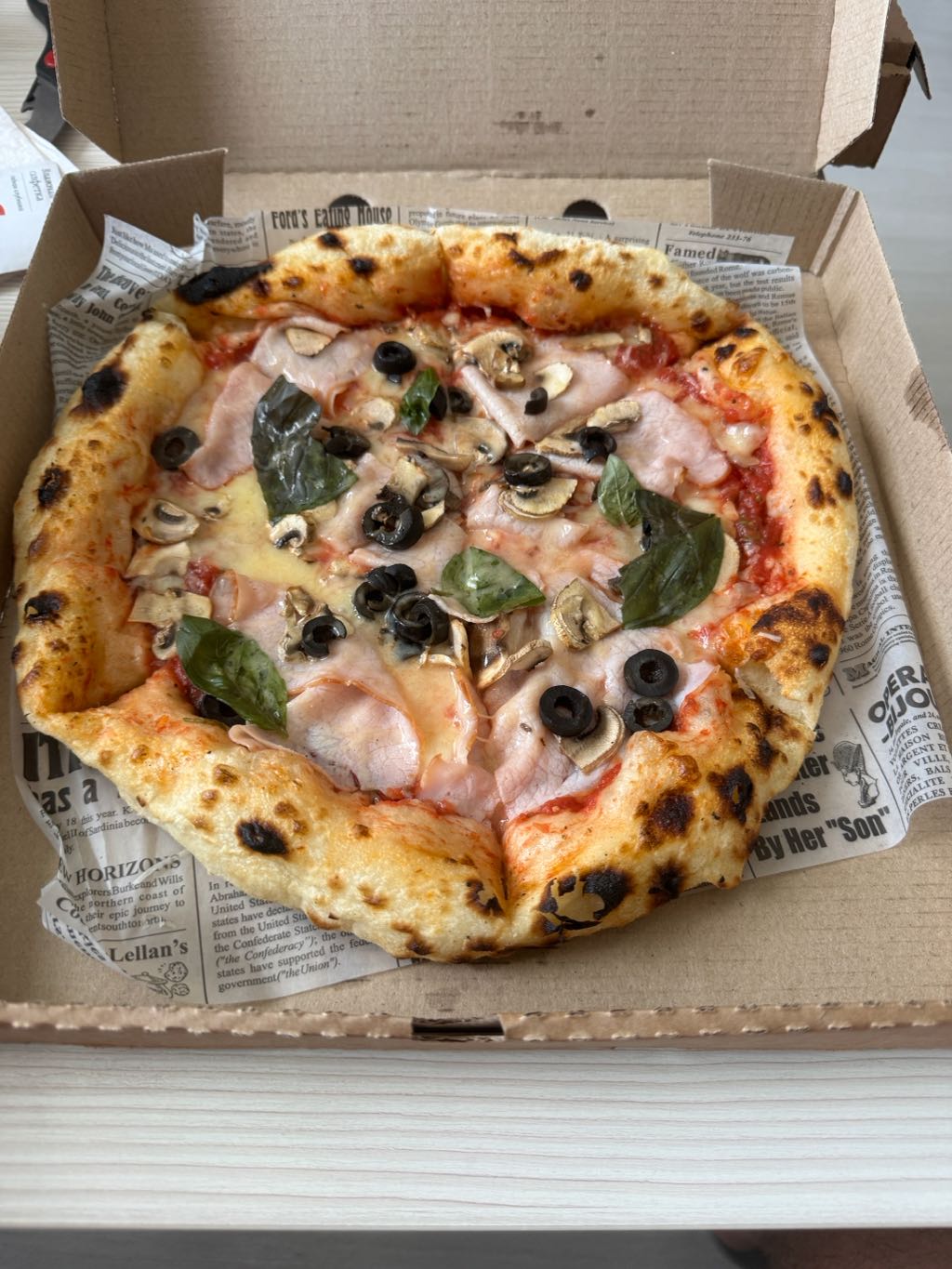 Состав: красный соус, ветчина, грибы шампиньоны, маслины, базилик, пармезан