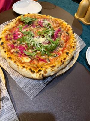 Состав: красный соус, рваная свинина, грибы шампиньоны, соус BBQ, маринованный лук, руккола, пармезан