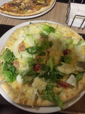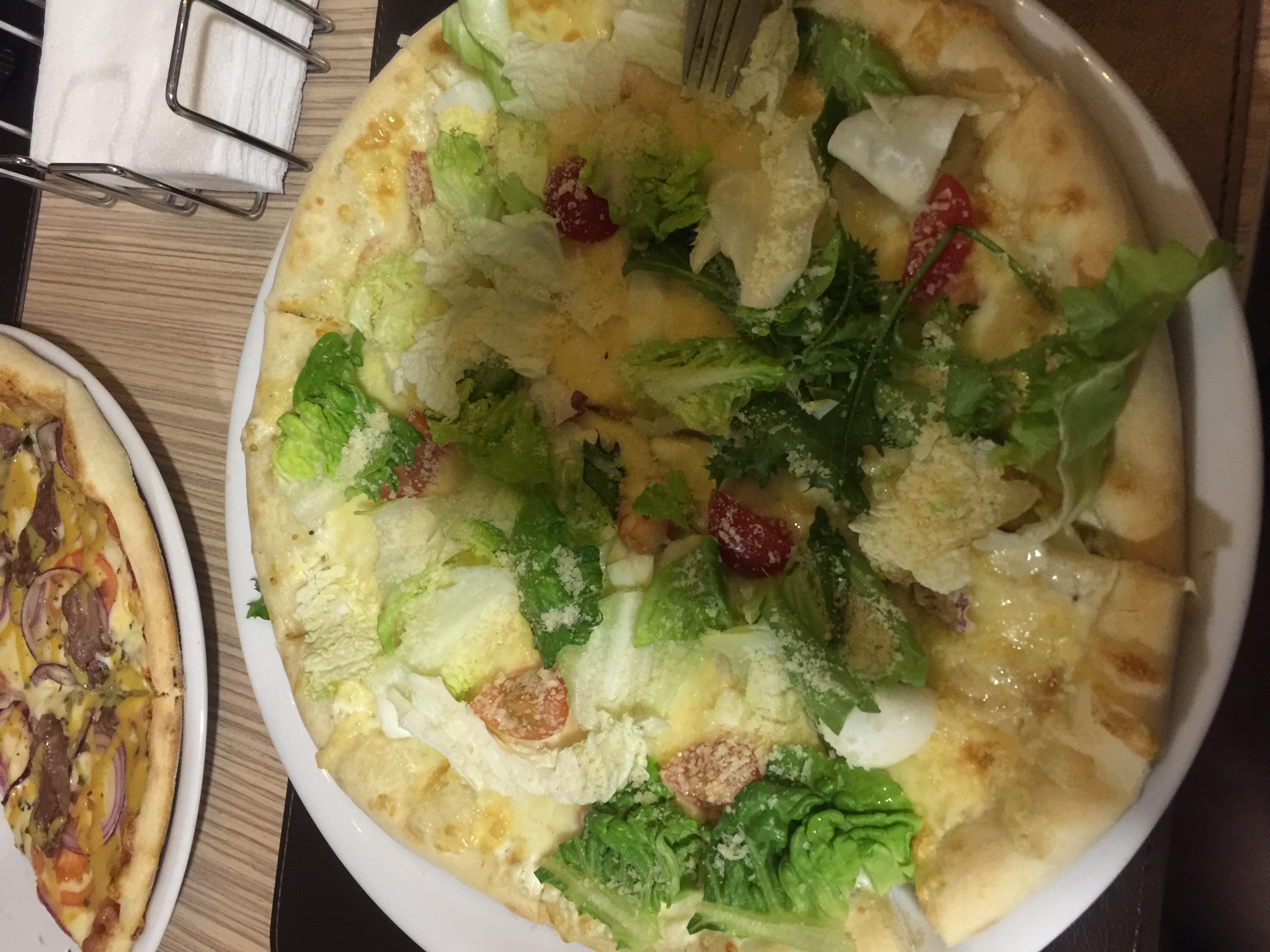 Состав: тесто, соус цезарь, моцарелла, курица, яйцо перепелиное, томаты черри, салат, сыр джюгас