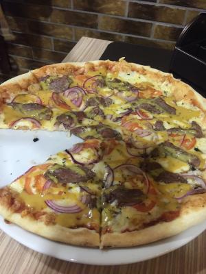 Состав: тесто, помидорная смесь, моцарелла, колбаса с/к, перец халапеньо, специи