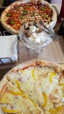 Состав: тесто, помидорная смесь, моцарелла, курица, цукини, шампиньоны, соус карри, масло чесночное, специи