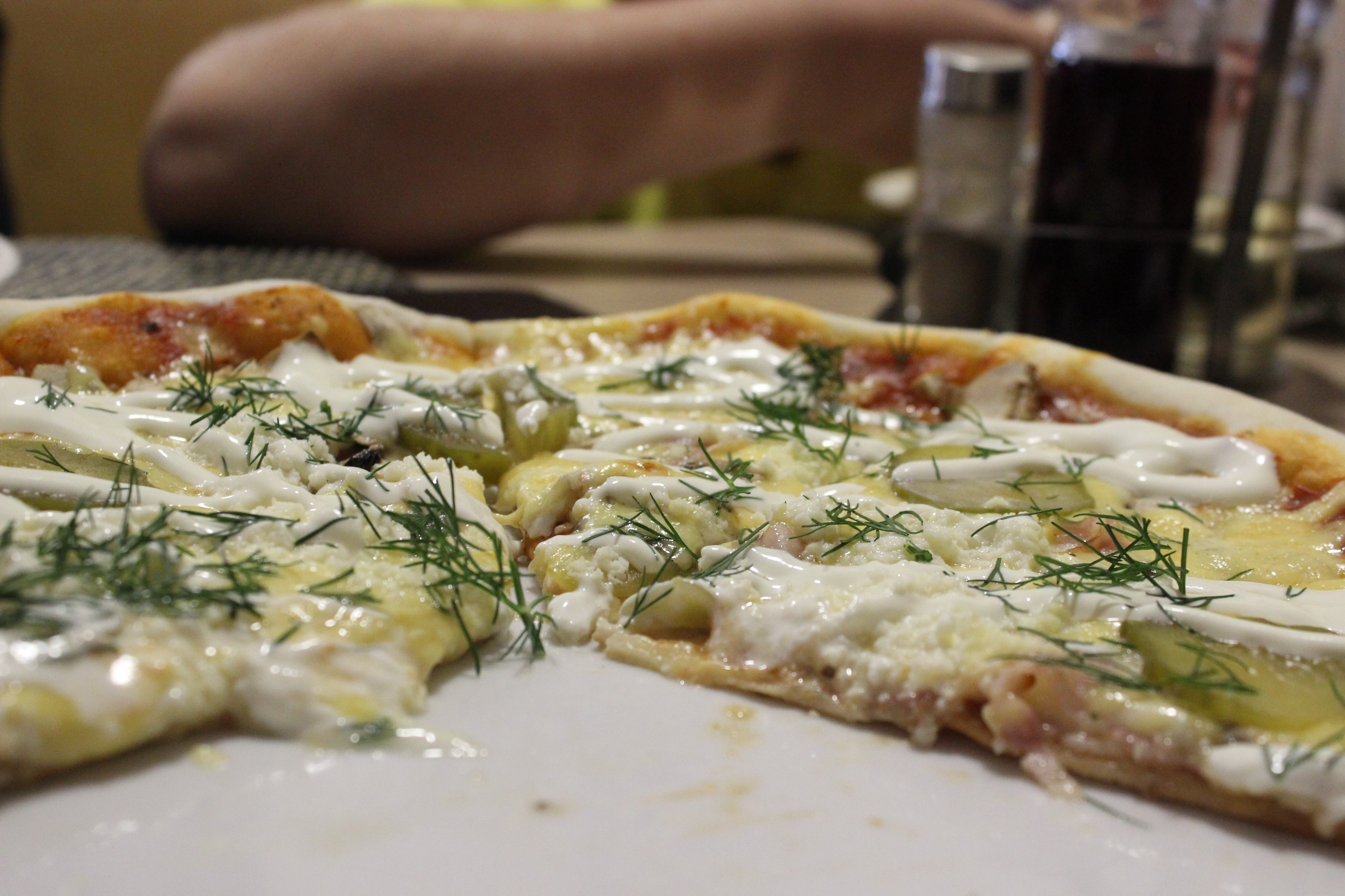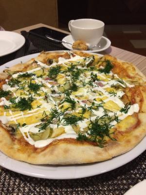 Состав: тесто, помидорная смесь, моцарелла, опята, белые грибы, бекон, огурец маринованный, лук-порей