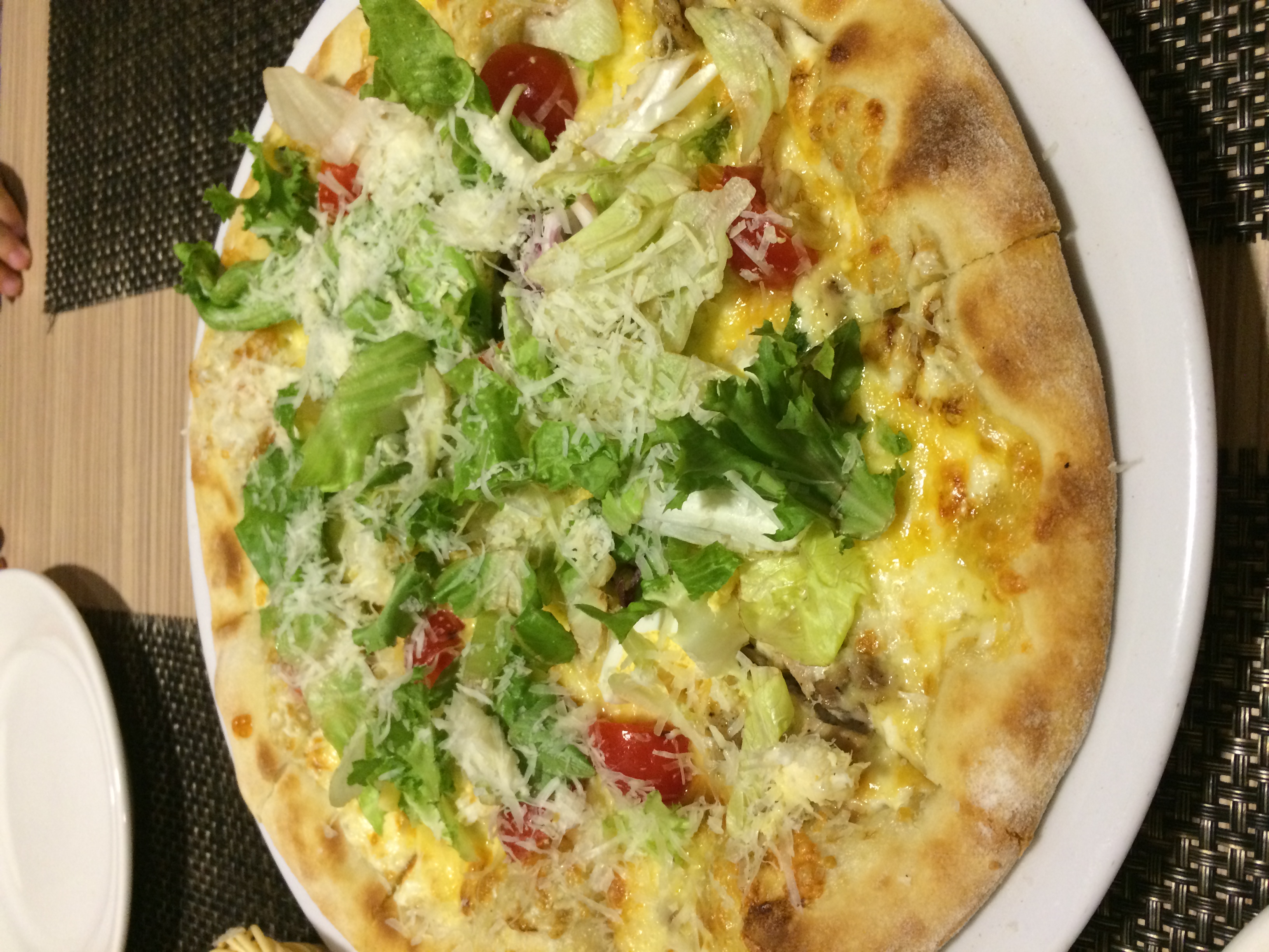 Состав: тесто, соус цезарь, моцарелла, курица, яйцо перепелиное, томаты черри, салат, сыр джюгас