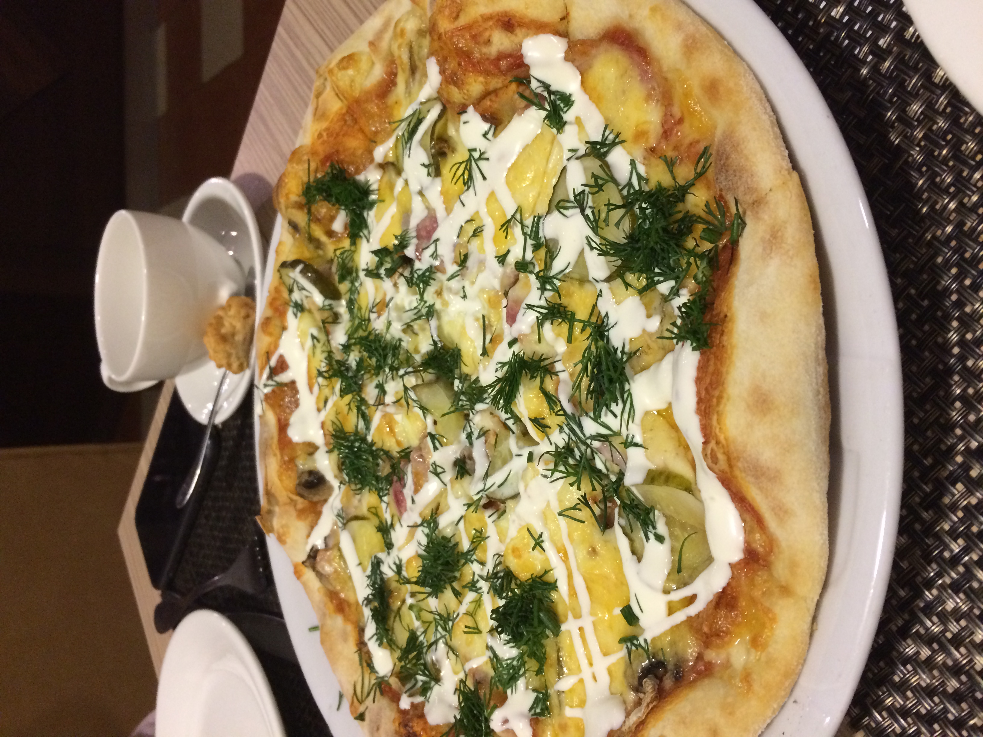 Состав: тесто, помидорная смесь, моцарелла, бекон, шампиньоны, сыр рикотта, маринованный огурец, яйцо, сметана, масло чесночное, зелень
