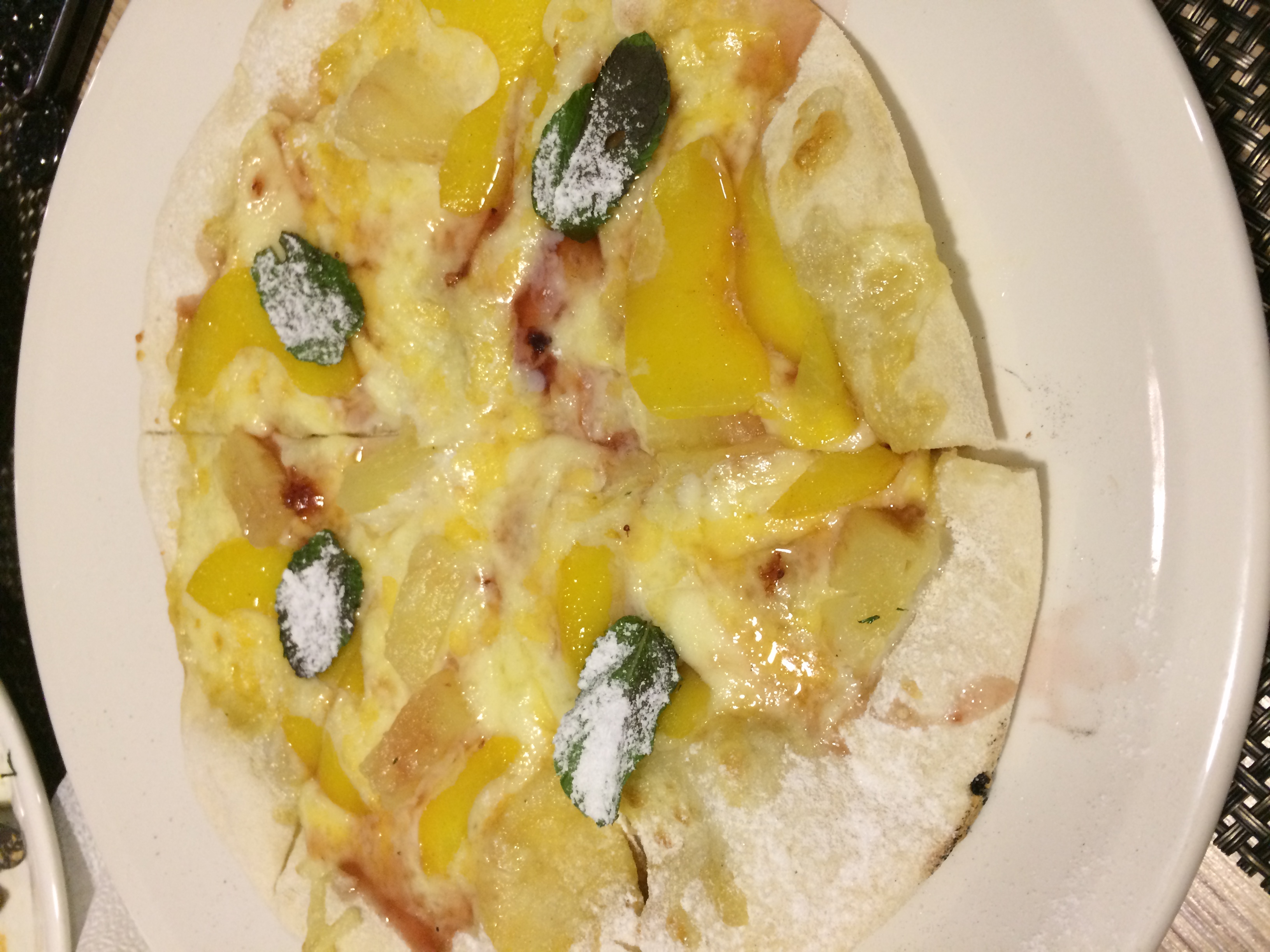 Состав: тесто, молоко сгущенное, моцарелла, консервированный ананас , консервированный персик, фруктовые топпинги
