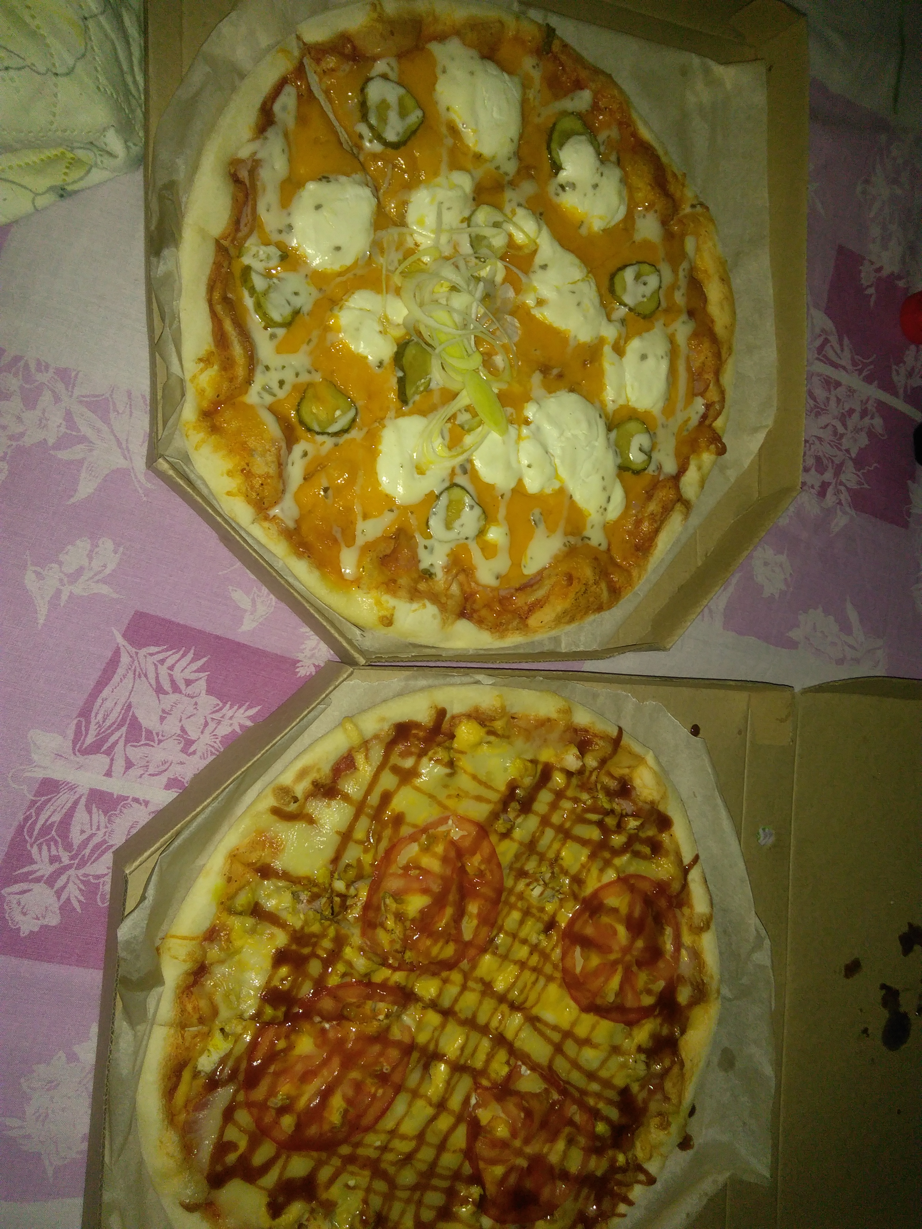 Состав: тесто, помидорная смесь, моцарелла, курица, ветчина, перец свежий, кукуруза, специи