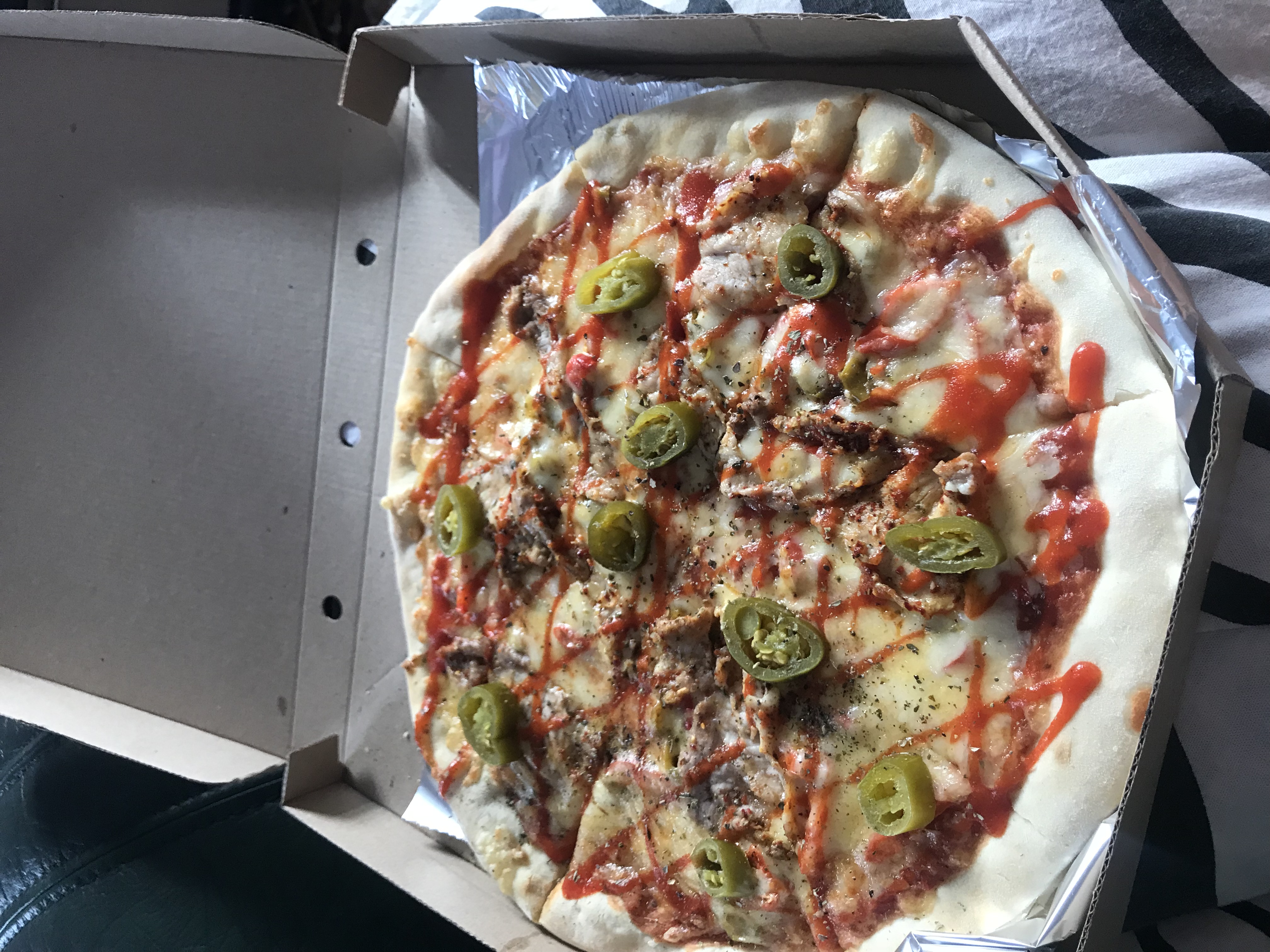 Состав: тесто, соус цезарь, моцарелла, балык, перец чили, перец халапеньо, бекон, кукуруза, соус песто