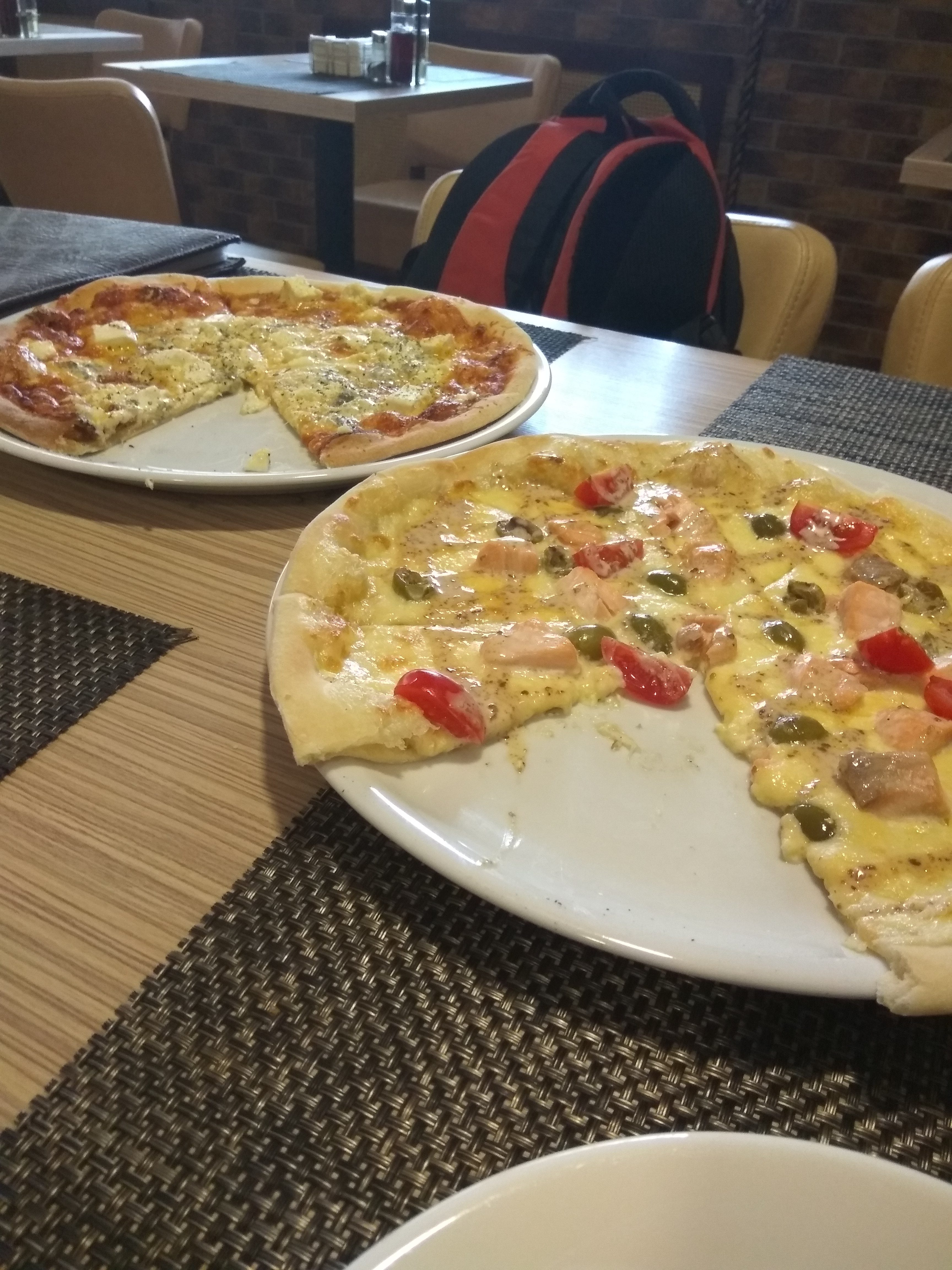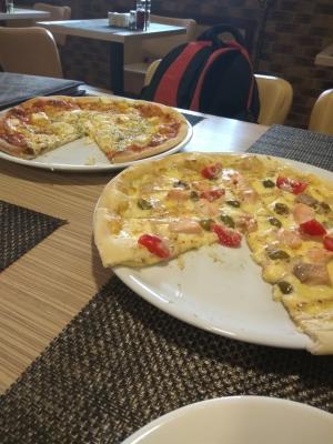 Состав: тесто, помидорная смесь, моцарелла, морской коктейль, лосось, лимон, специи