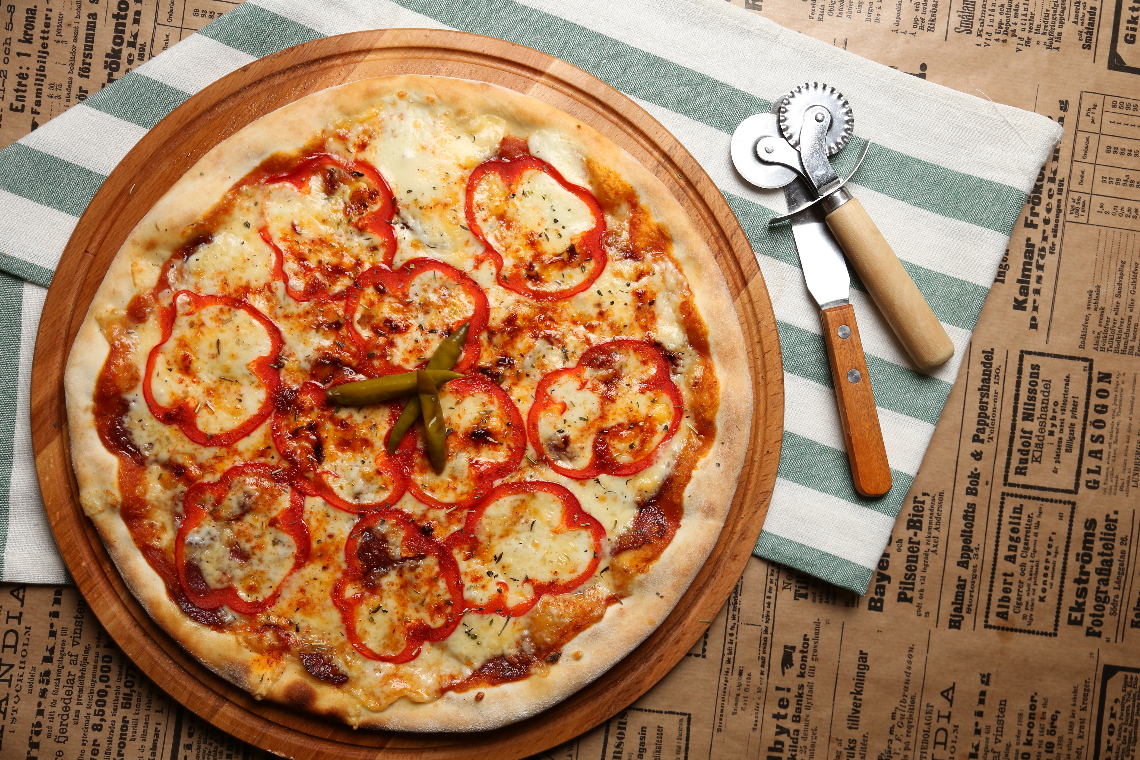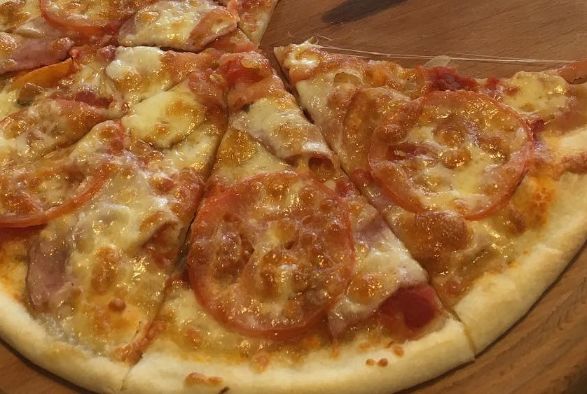 Состав: тесто, соус цезарь, моцарелла, балык, перец чили, перец халапеньо, бекон, кукуруза, соус песто