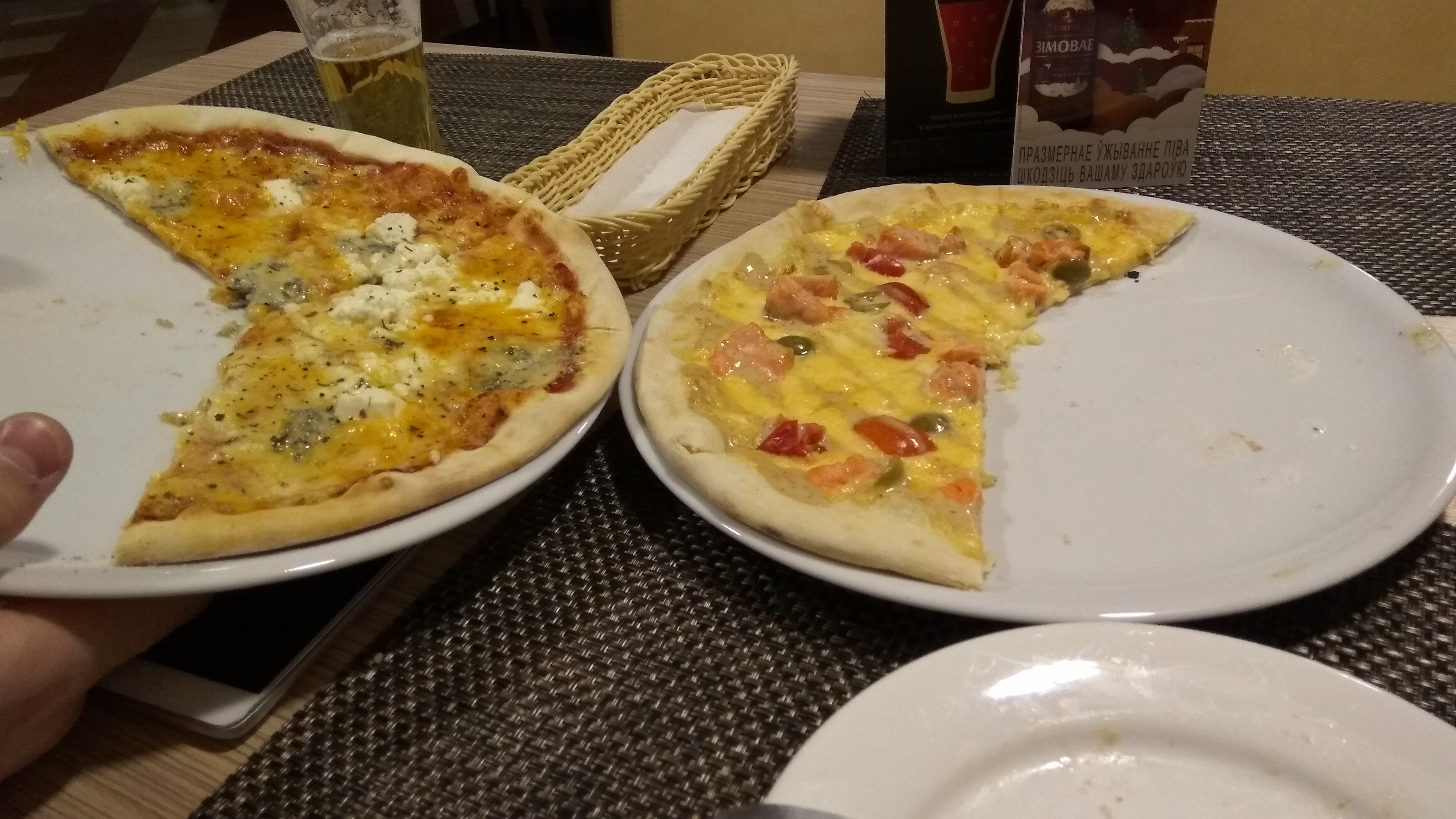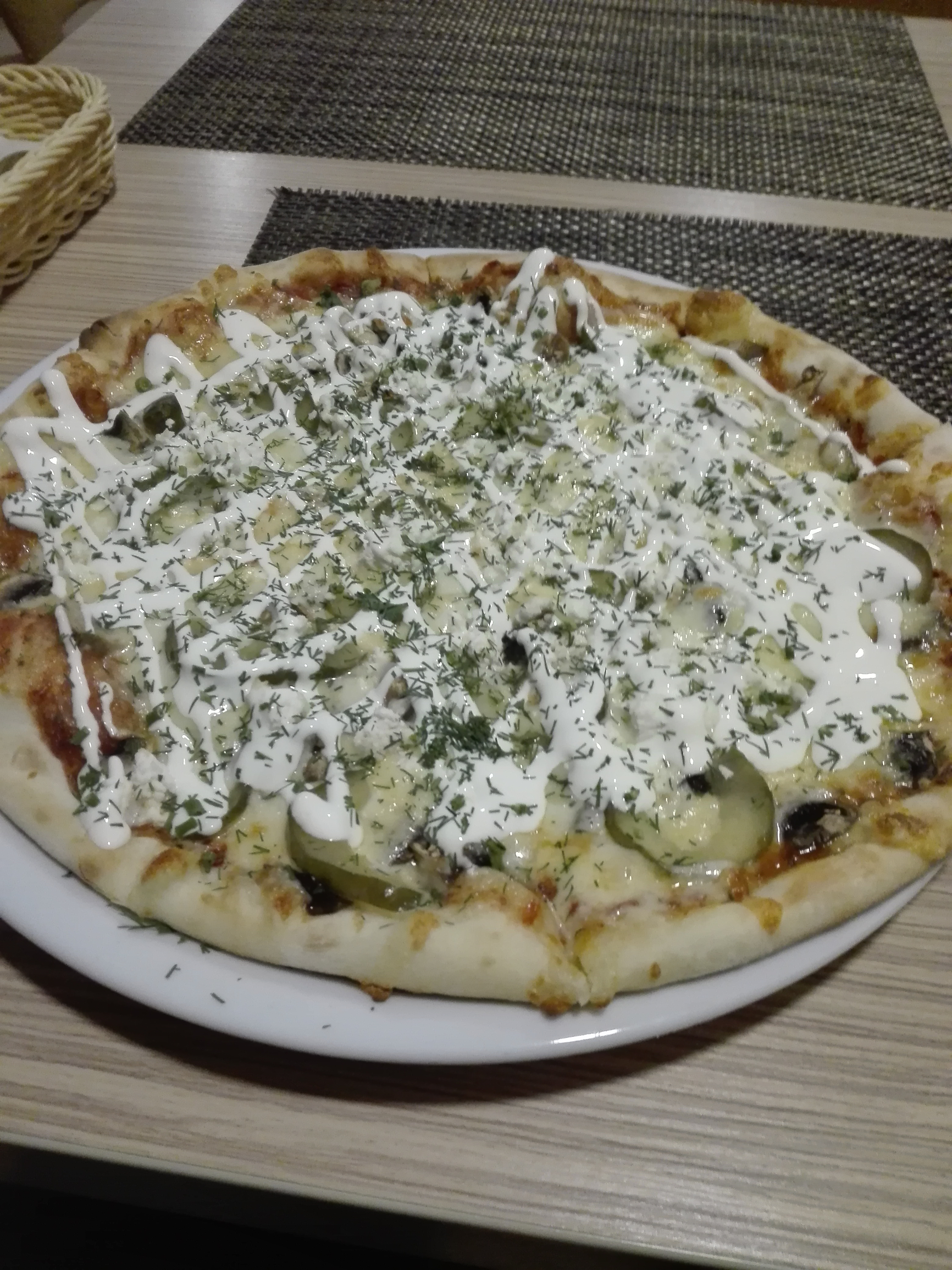Состав: тесто, помидорная смесь, моцарелла, опята, белые грибы, бекон, огурец маринованный, лук-порей