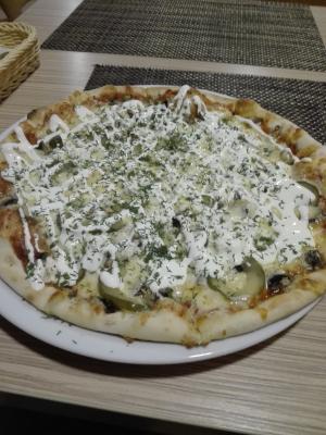 Состав: тесто, помидорная смесь, моцарелла, курица, цукини, шампиньоны, соус карри, масло чесночное, специи
