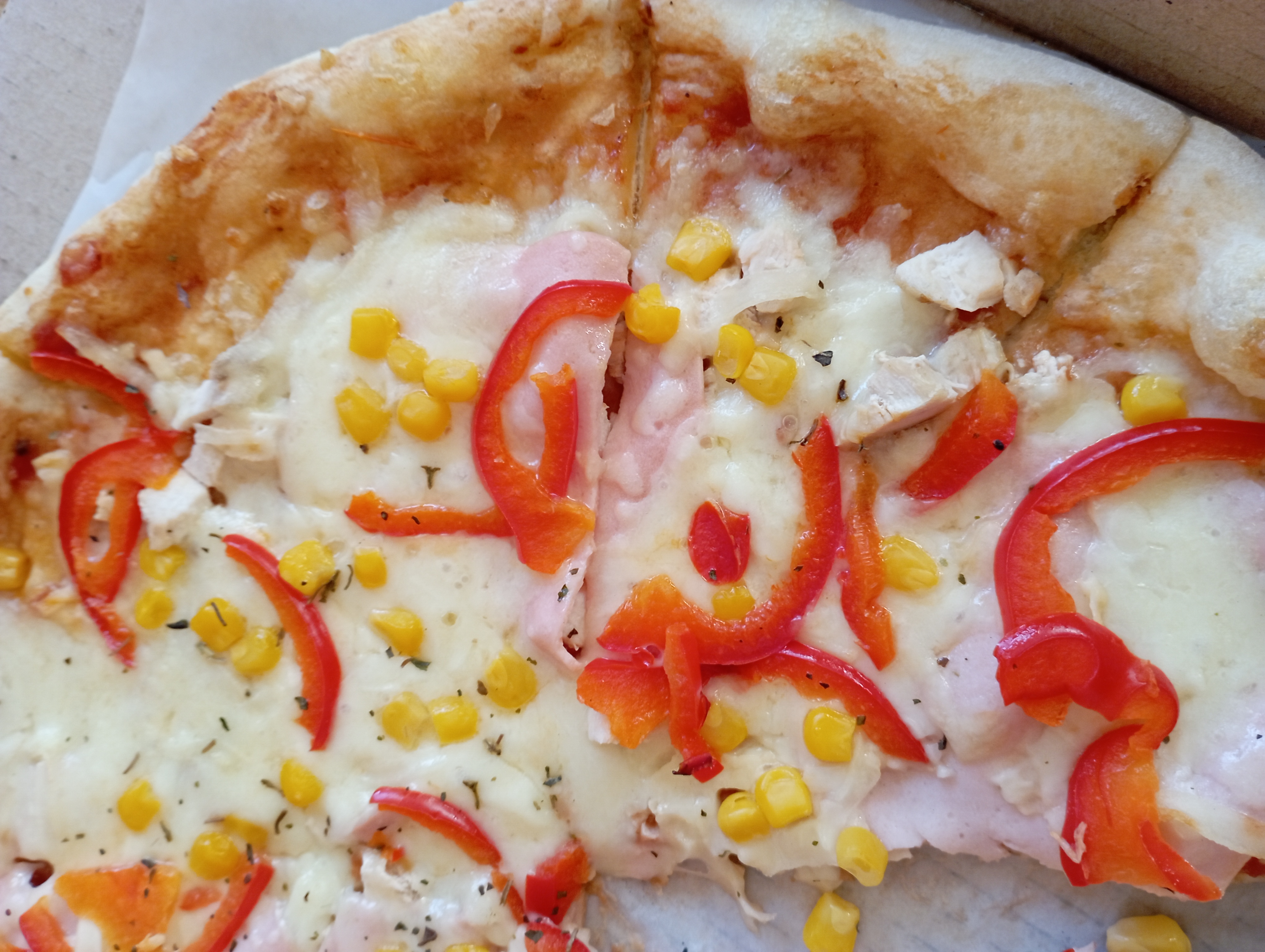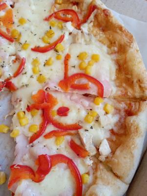 Состав: тесто, помидорная смесь, моцарелла, курица, ветчина, перец свежий, кукуруза, специи