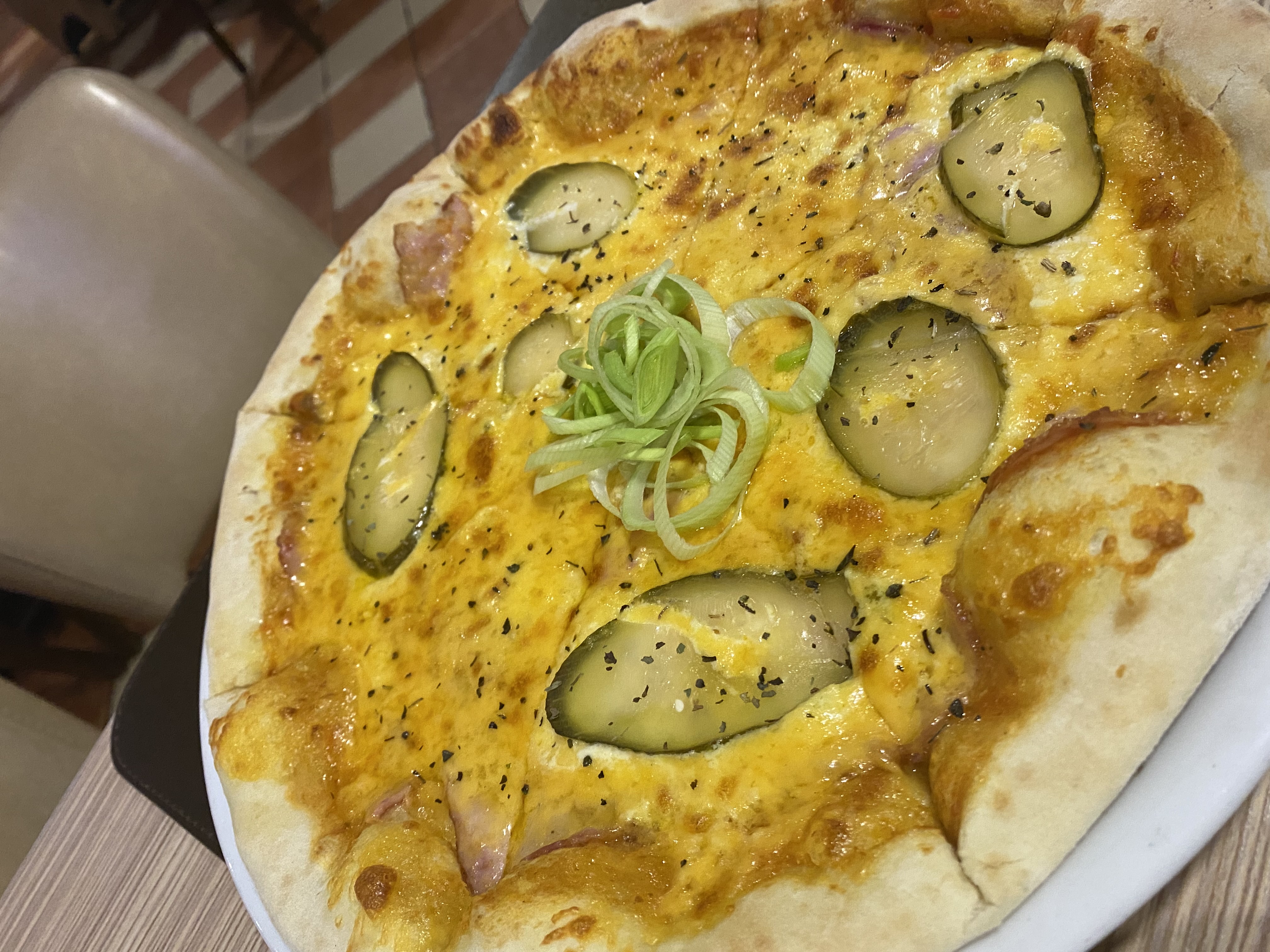 Состав: тесто, помидорная смесь, моцарелла, опята, белые грибы, бекон, огурец маринованный, лук-порей