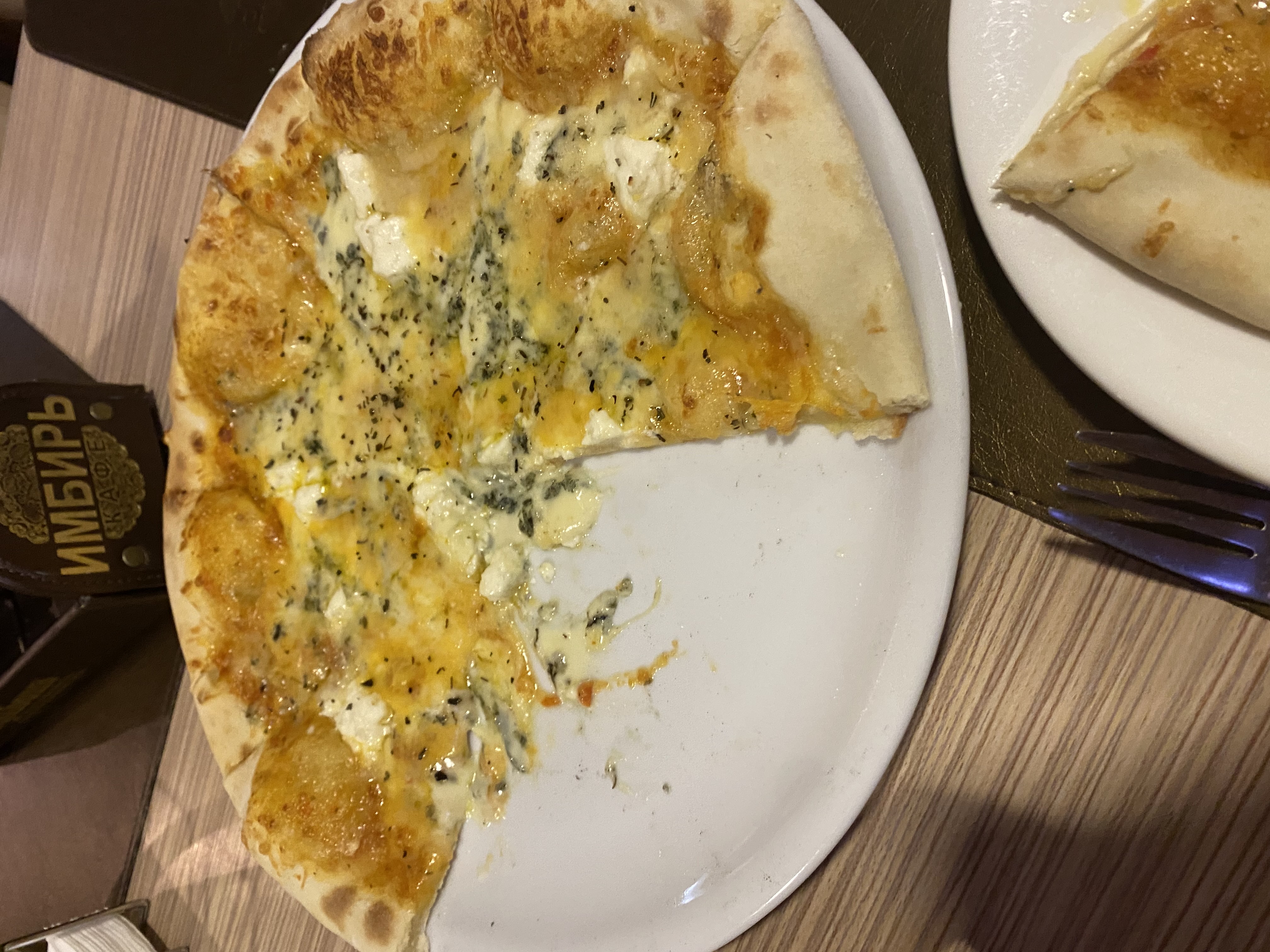 Состав: тесто, помидорная смесь, сыр дор блю, моцарелла, груша, специи