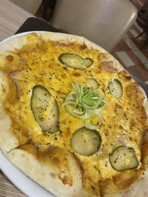 Состав: тесто, помидорная смесь, моцарелла, курица, цукини, шампиньоны, соус карри, масло чесночное, специи