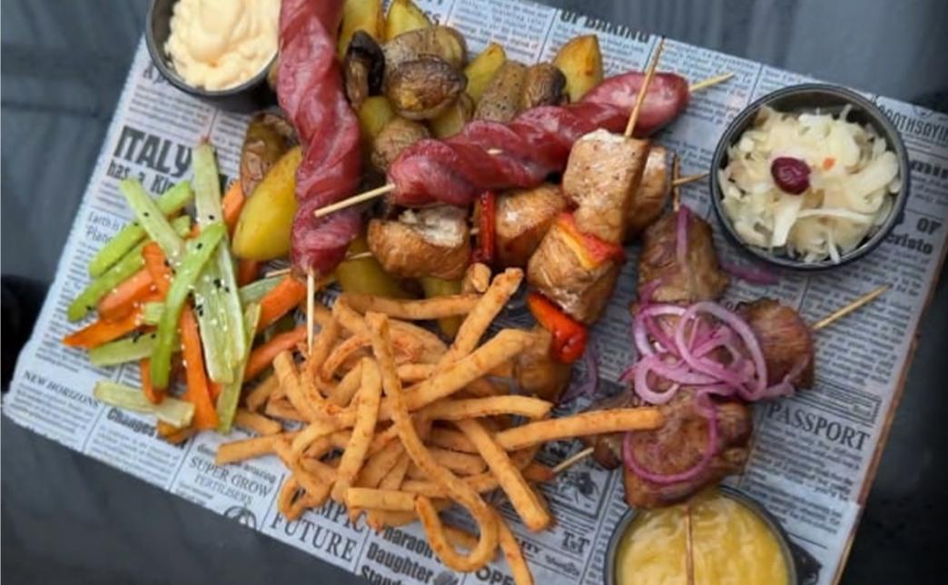 Состав: шашлык куриный, охотничьи колбаски, шашлык из свинины, картофельные дольки, шампиньоны жареные, капуста квашеная, хворост сырный, сельдерей, морковь, соус сырный, соус горчичный
