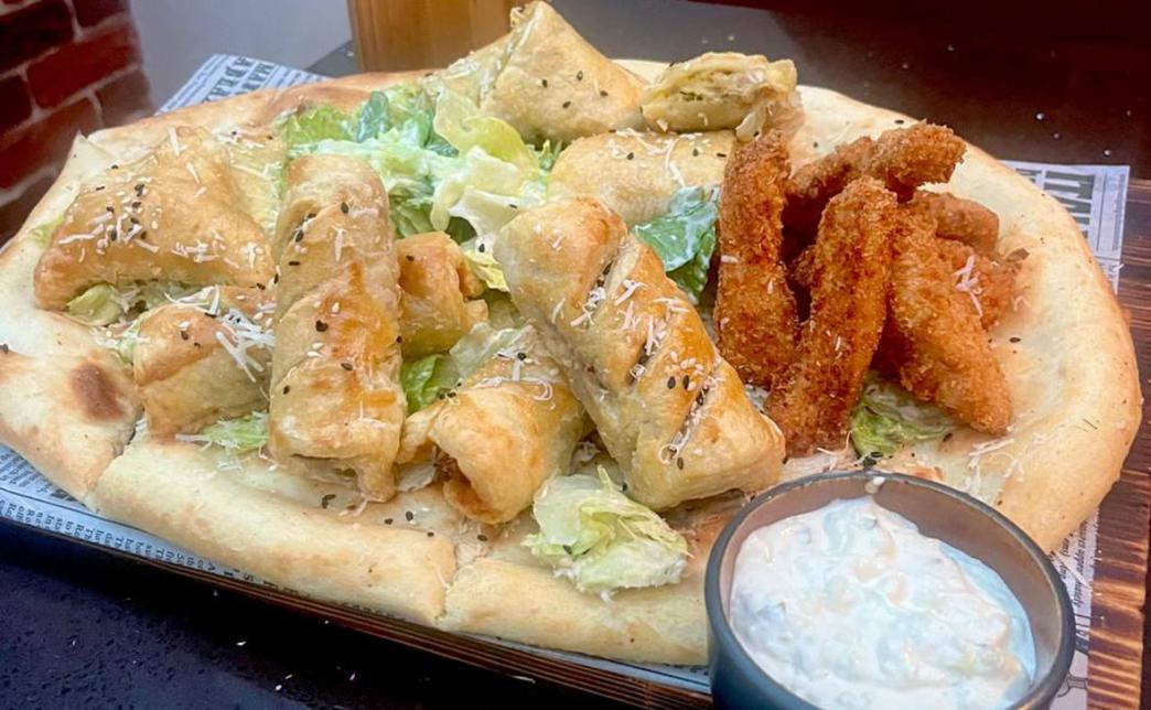 Состав: мини-корндог, слойка с грибами, ролл с рваной свининой, куриные стрипсы, пицца римская, соус барбекю, соус тар-тар