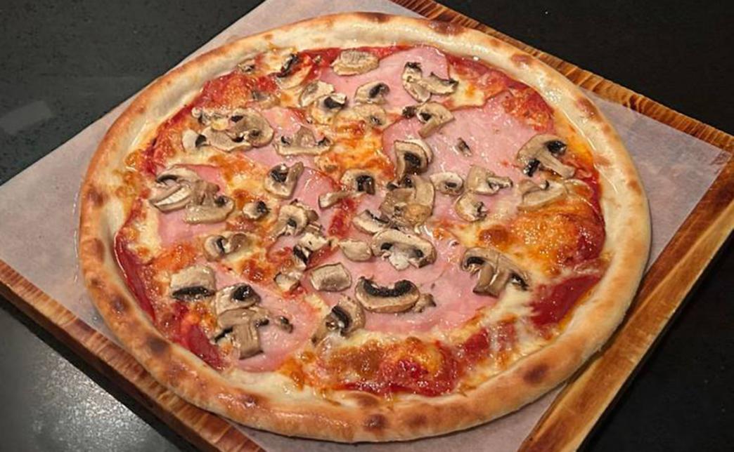 Состав: соус для пиццы, сыр моцарелла, ветчина, шампиньоны