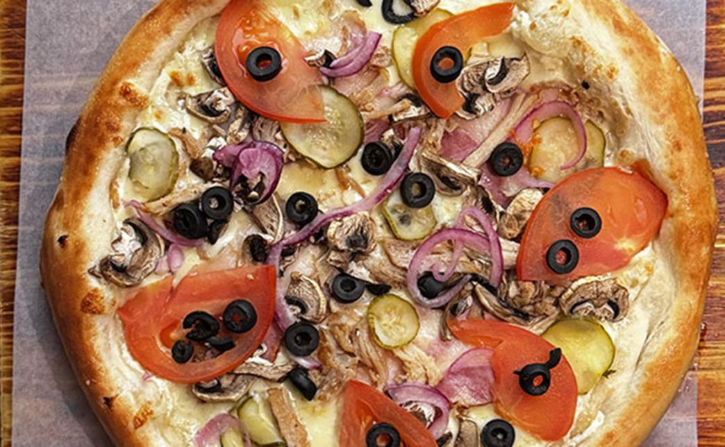 Состав: соус для пиццы, сыр моцарелла, свиная вырезка, грудинка копченая, шампиньоны, томаты, лук, корнишоны, маслины