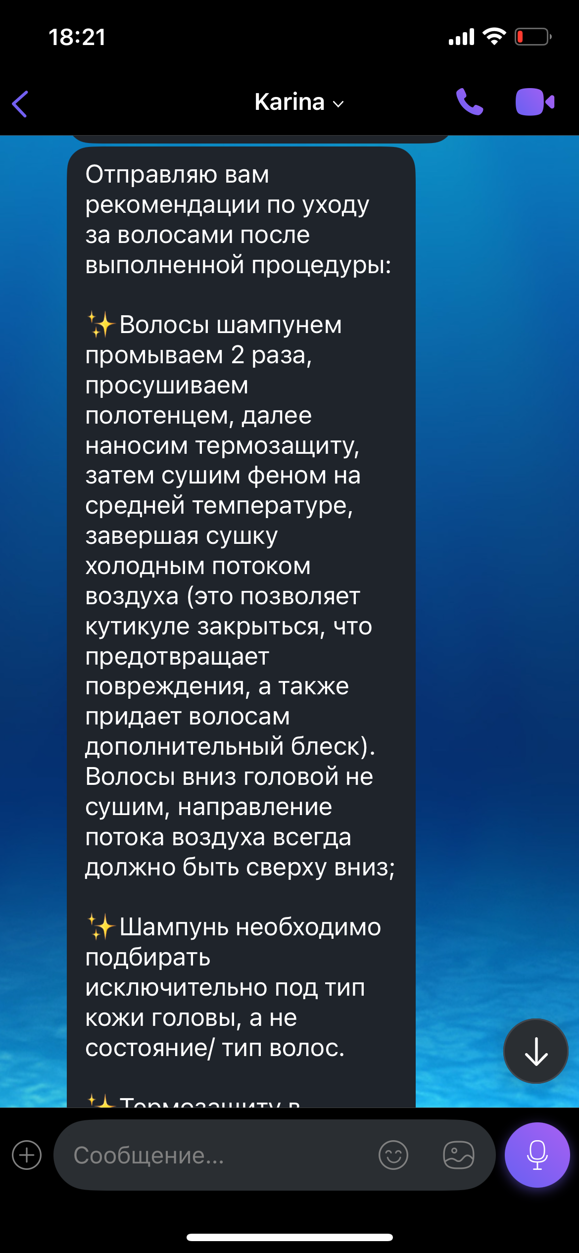 Процедура прошла быстро и в теплой обстановке 🤗Я была приятно удивлена тем, насколько профессионально Карина подходит к своей работе. Результат превзошел все мои ожидания! Волосы выглядят здоровыми, блестящими и стильно уложенными и ухоженными.