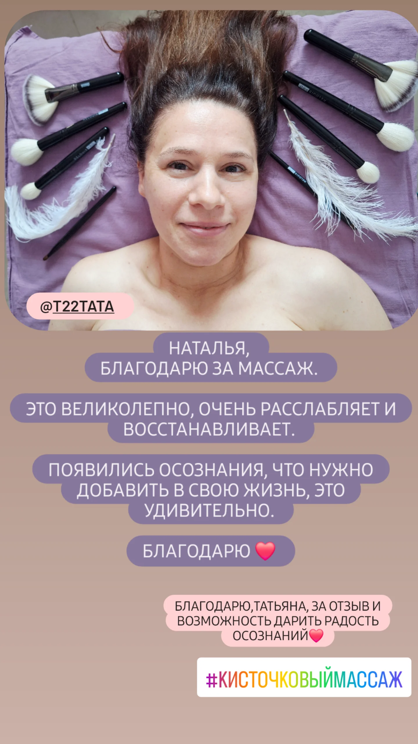У Натальи чудесные руки! После массажа тело расслабилось и наполнилось энергией! Наталья рассказала о ладование тела и кисточковом массаже, очень откликнулось, обязательно попробую. Благодарю Наталью за чудесный массаж! К рекомендации 100%!!!!