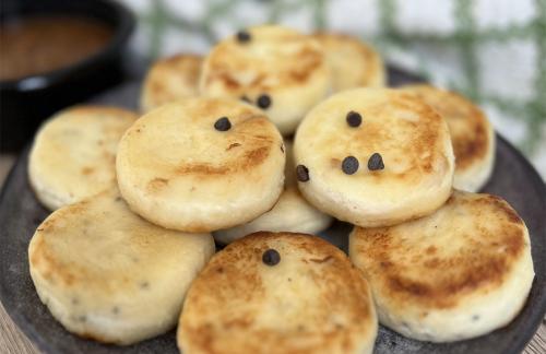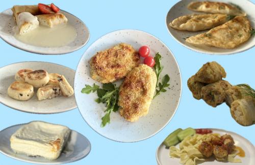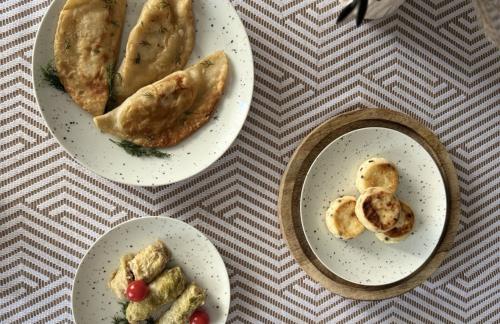 - чебурек с курицей, чебурек с говядиной и свининой, чебурек с сыром сулугуни и укропом, с соусом "Дзадзыки", зеленый лук