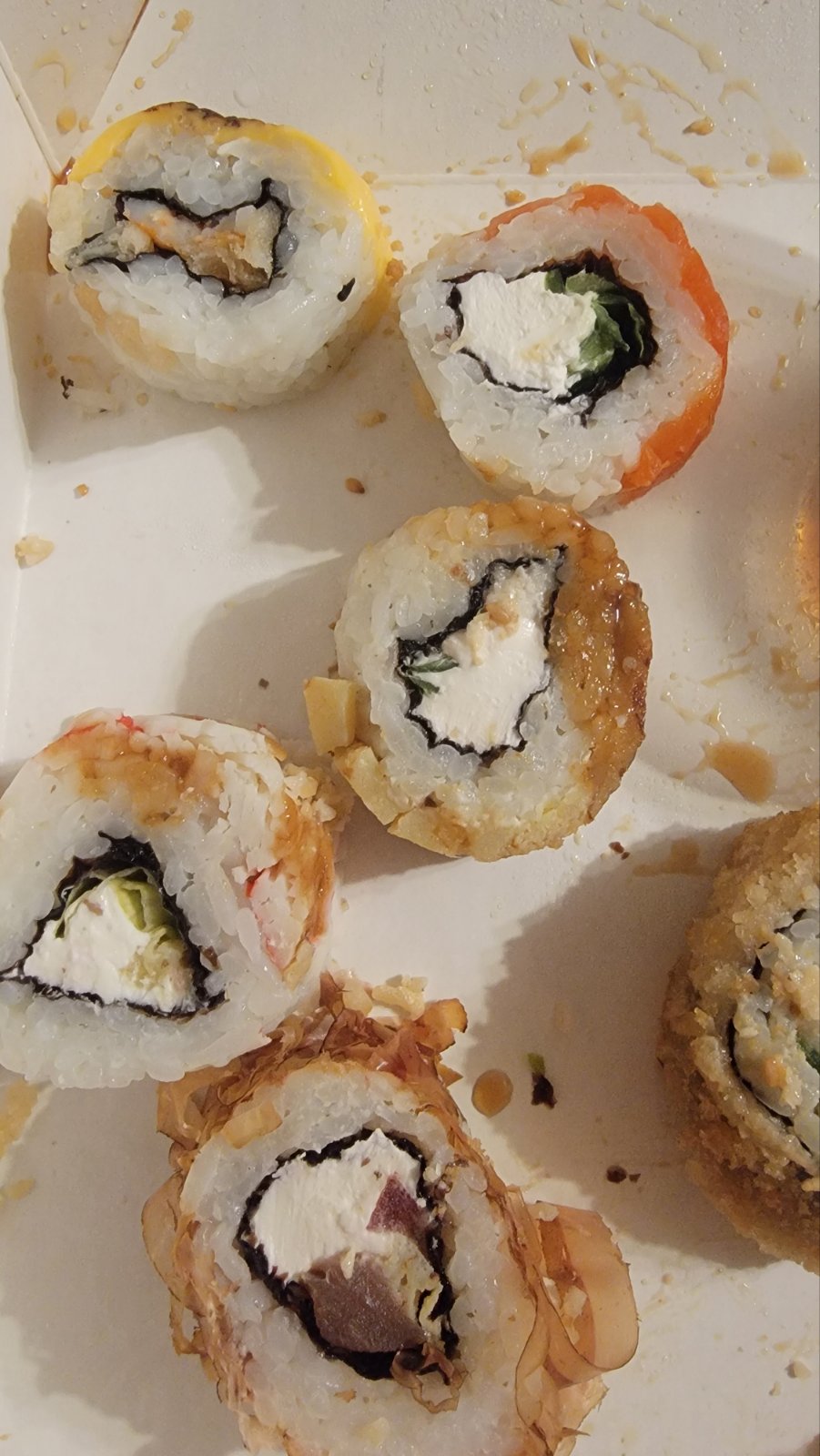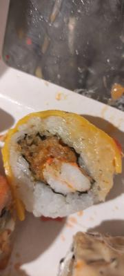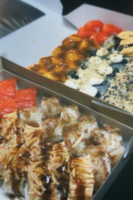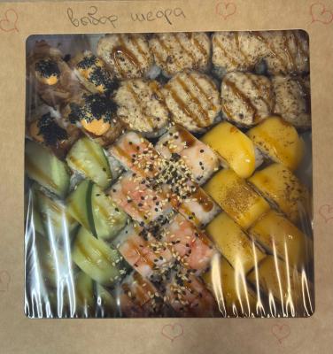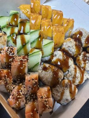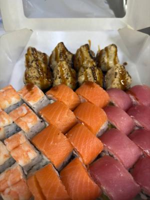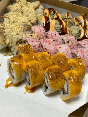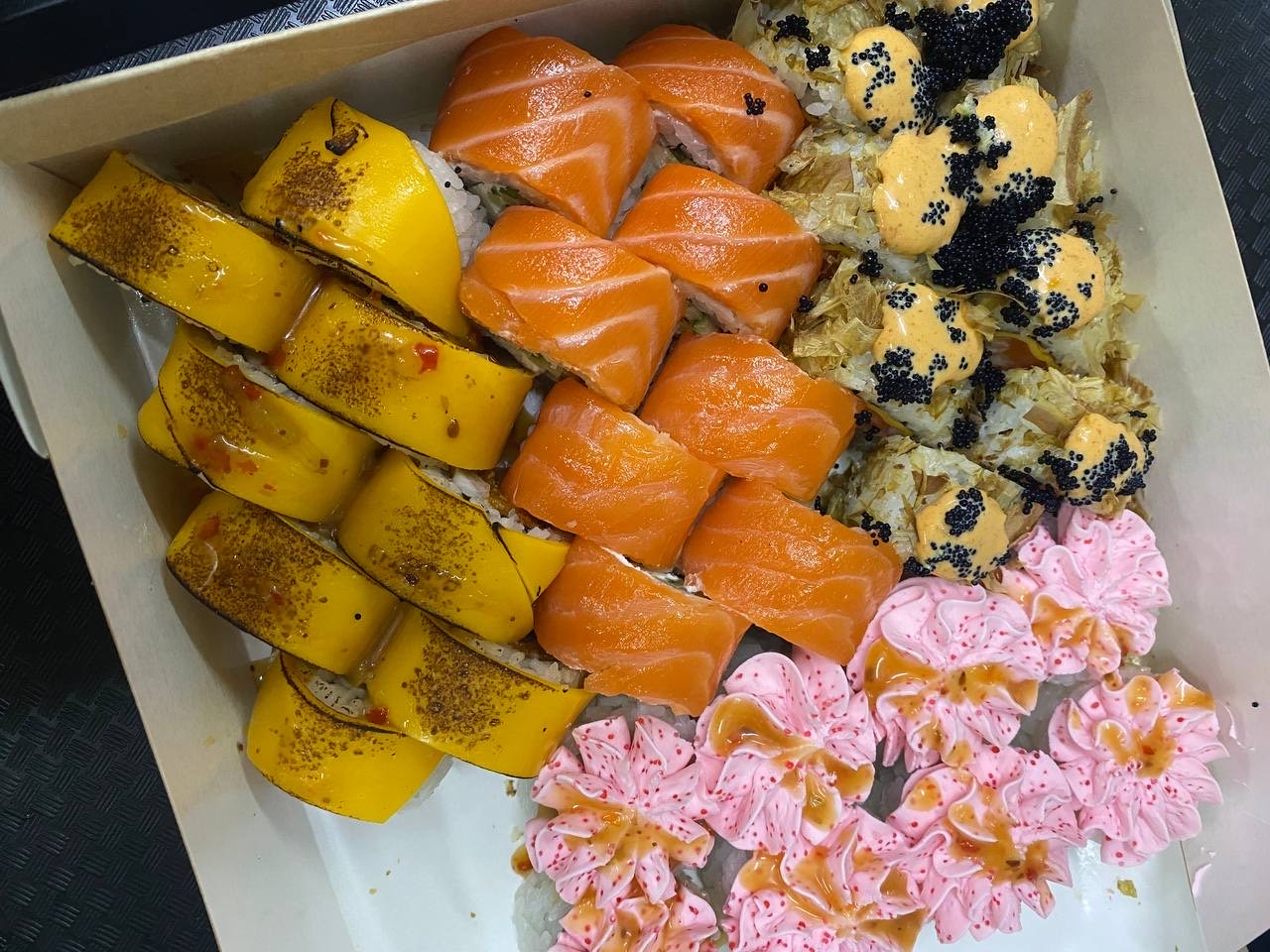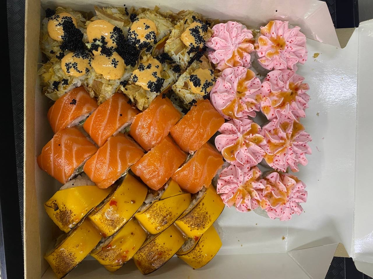 - "Бостон": креветка, сливочный сыр, ананас, салат Айсберг, соус сладко-ореховый, икра Тобико красная. Острое - 8 шт.
