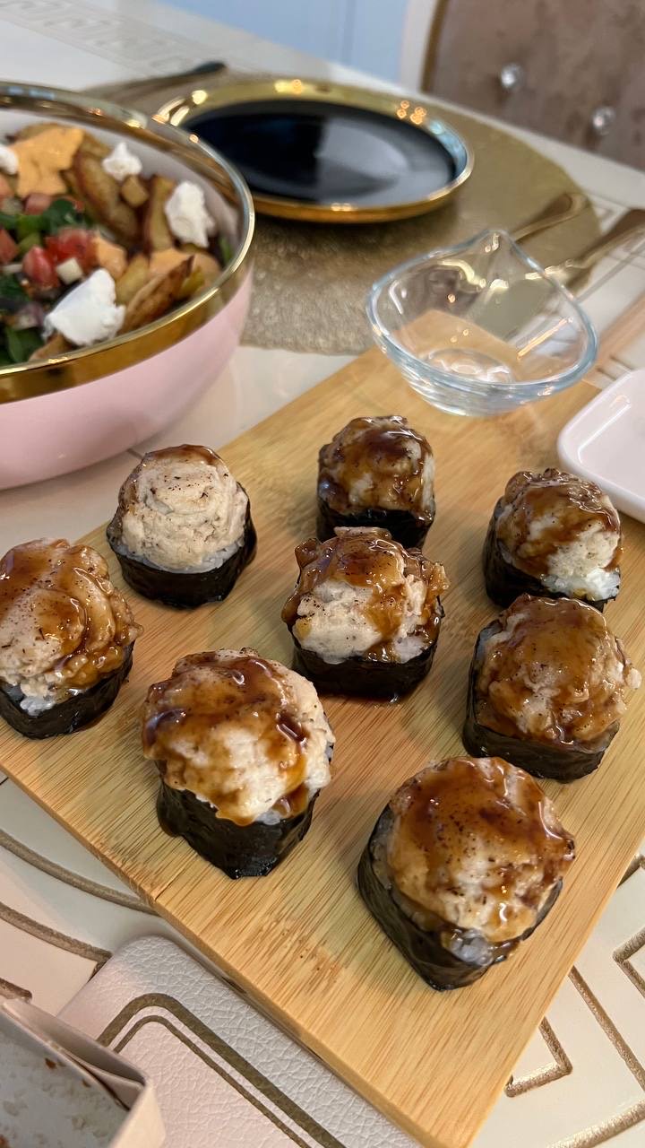 - "Цезарь": цыпленок-гриль, сливочный сыр, салат айсберг, томат, орехи кешью, сырный соус - 8 шт.