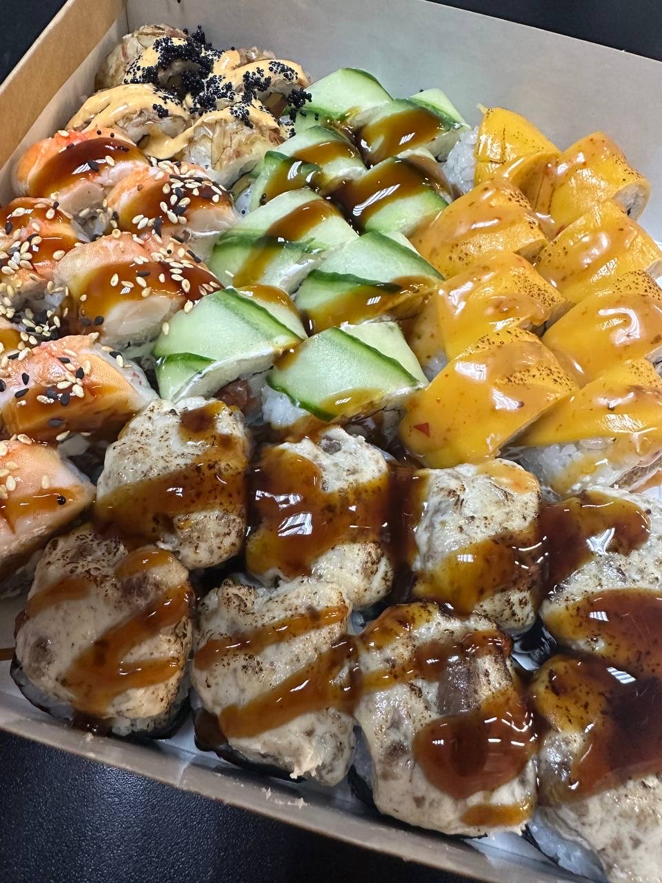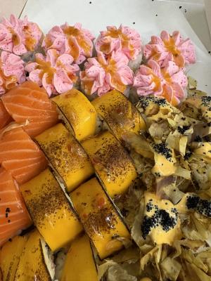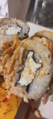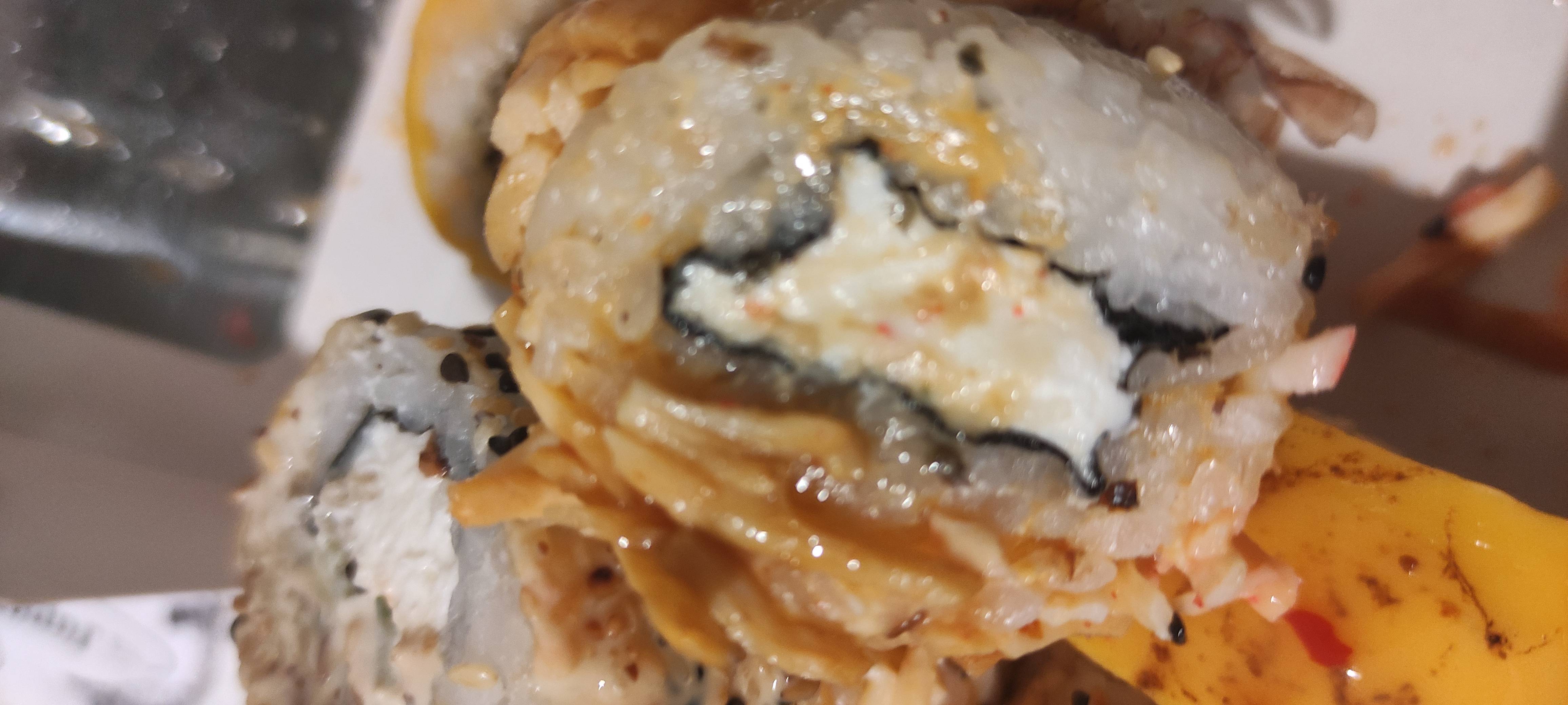 - ролл "Колорадо": жареный лосось в соусе терияки, сыр чеддер, соус сырный, криспи - 8 шт.