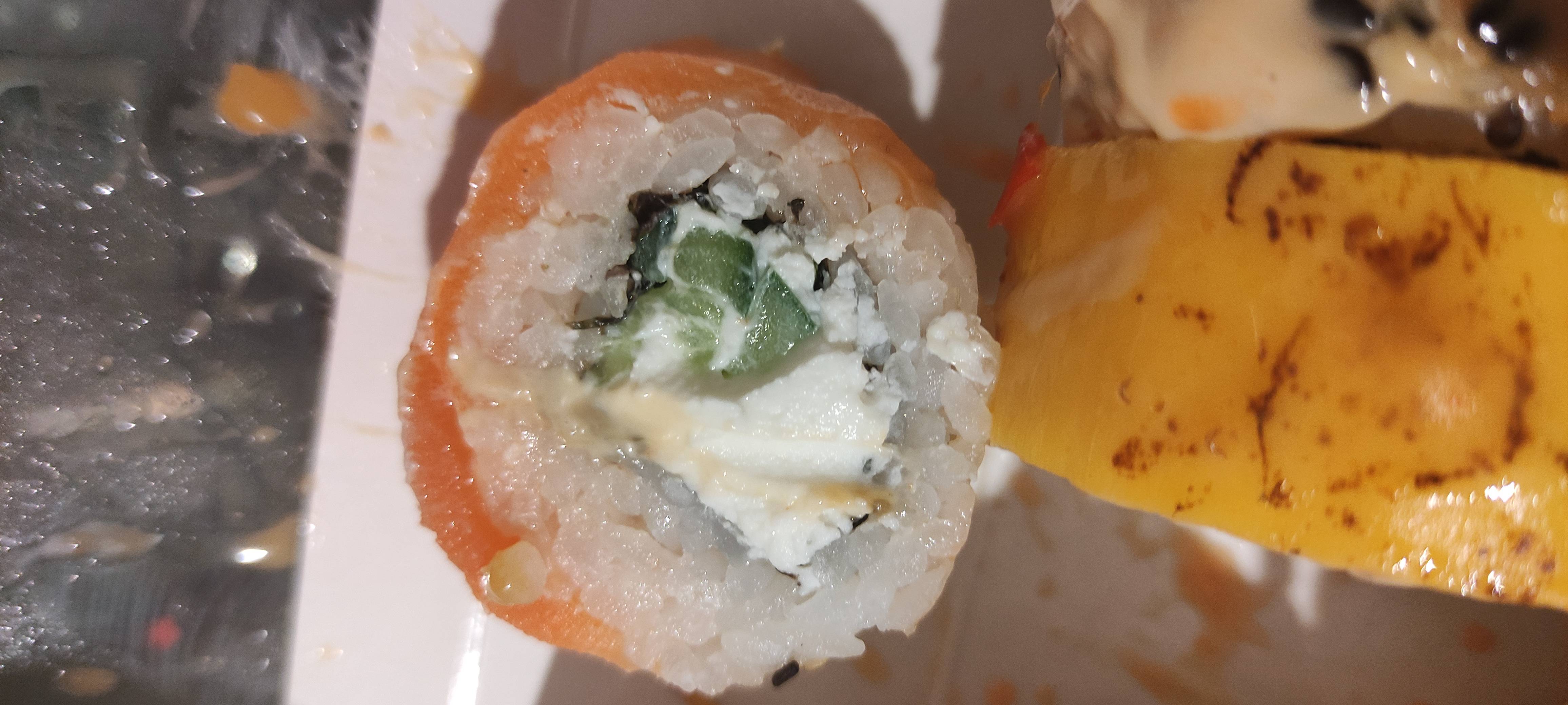 - "Чарлстон": филе лосося, сливочный сыр, филе тунца, лук жареный, огурец - 8 шт.