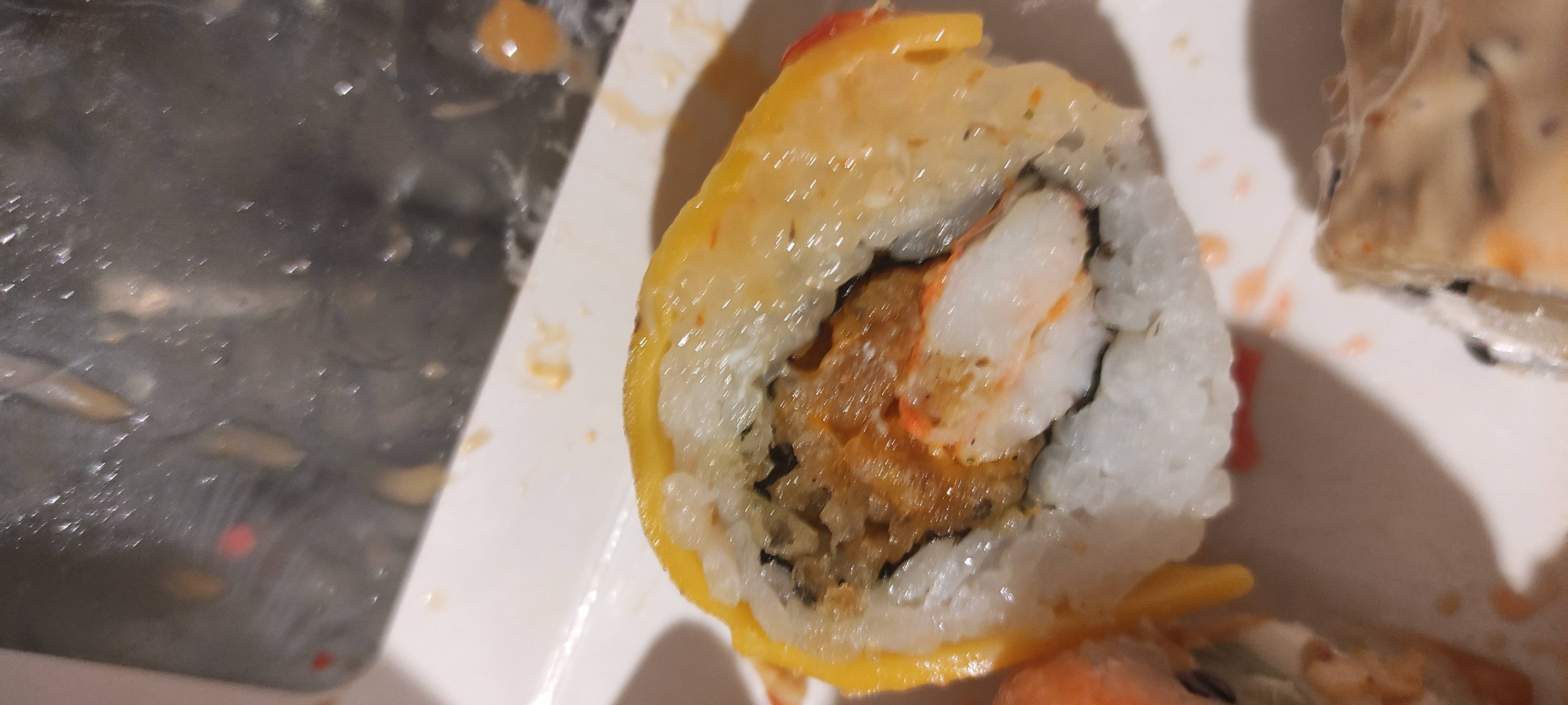 - "Висконсин🌶": креветка, сыр чеддер, пряный соус, соус сладко-ореховый, криспи - 8 шт.