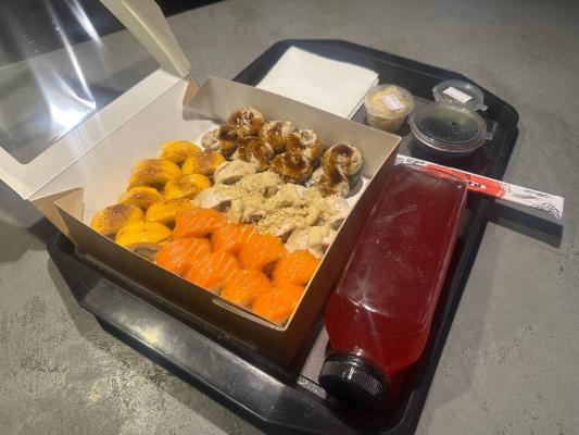 - "Детройт": цыпленок-гриль, томат, салат Айсберг, такуан, сливочный сыр, луковый мармелад, соус Лос-Анджелес и орехи кешью - 8 шт.