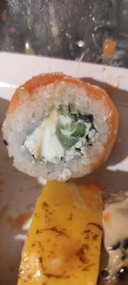 - ролл с лососем и манго в кунжуте кимчи: филе лосося, сливочный сыр, салат айсберг, манго, кунжут кимчи - 8 шт.