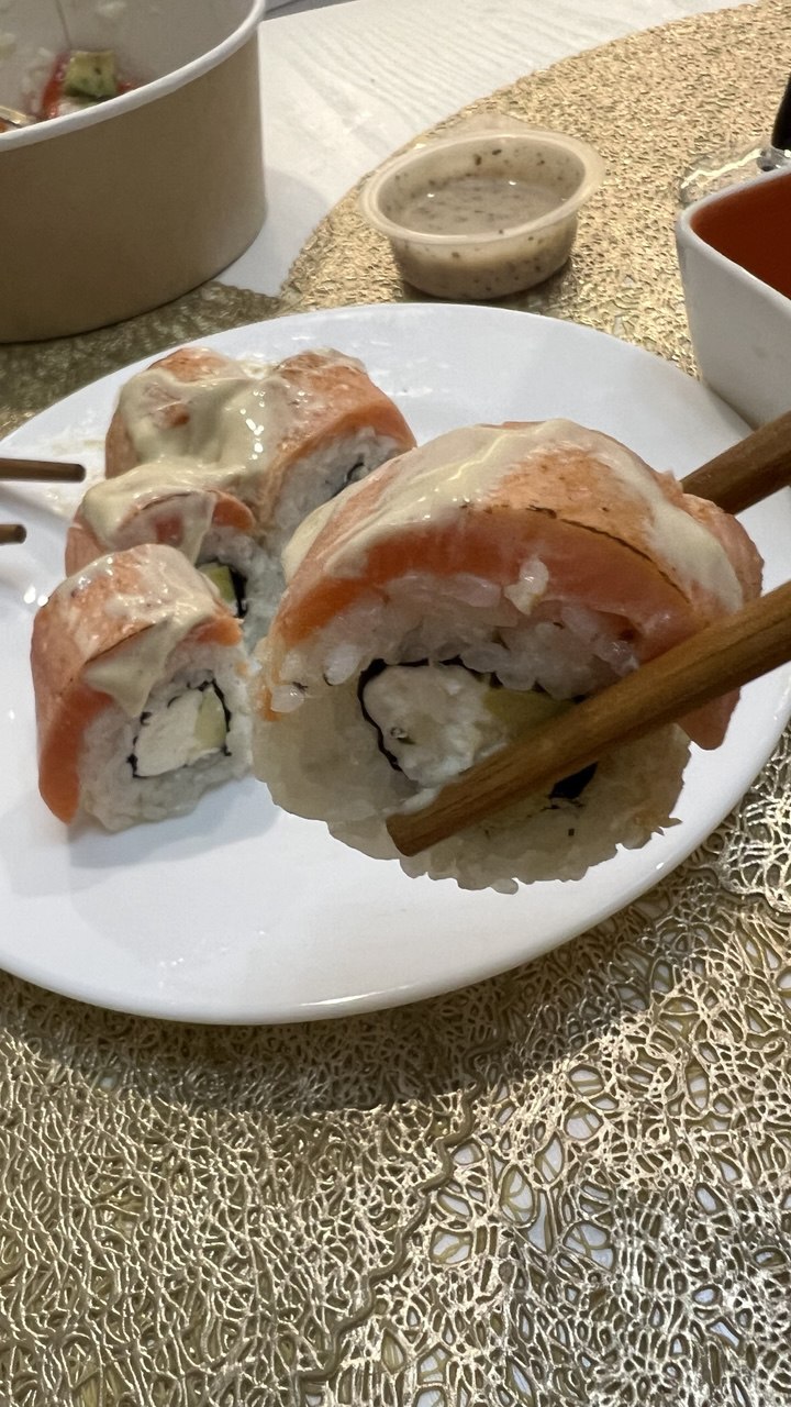 Заказали сет Жара в 12.10.2025 в 17:50, доставить должны были в 19:30, доставили в 20:00, вместо двух приборов положили один. Впрочем на вкус как и сервис, отвратительно! Суши в панировке безвкусные, рол под шапкой на вкус дешевое подсолнечное масло. Одно разочарование, ничего больше.