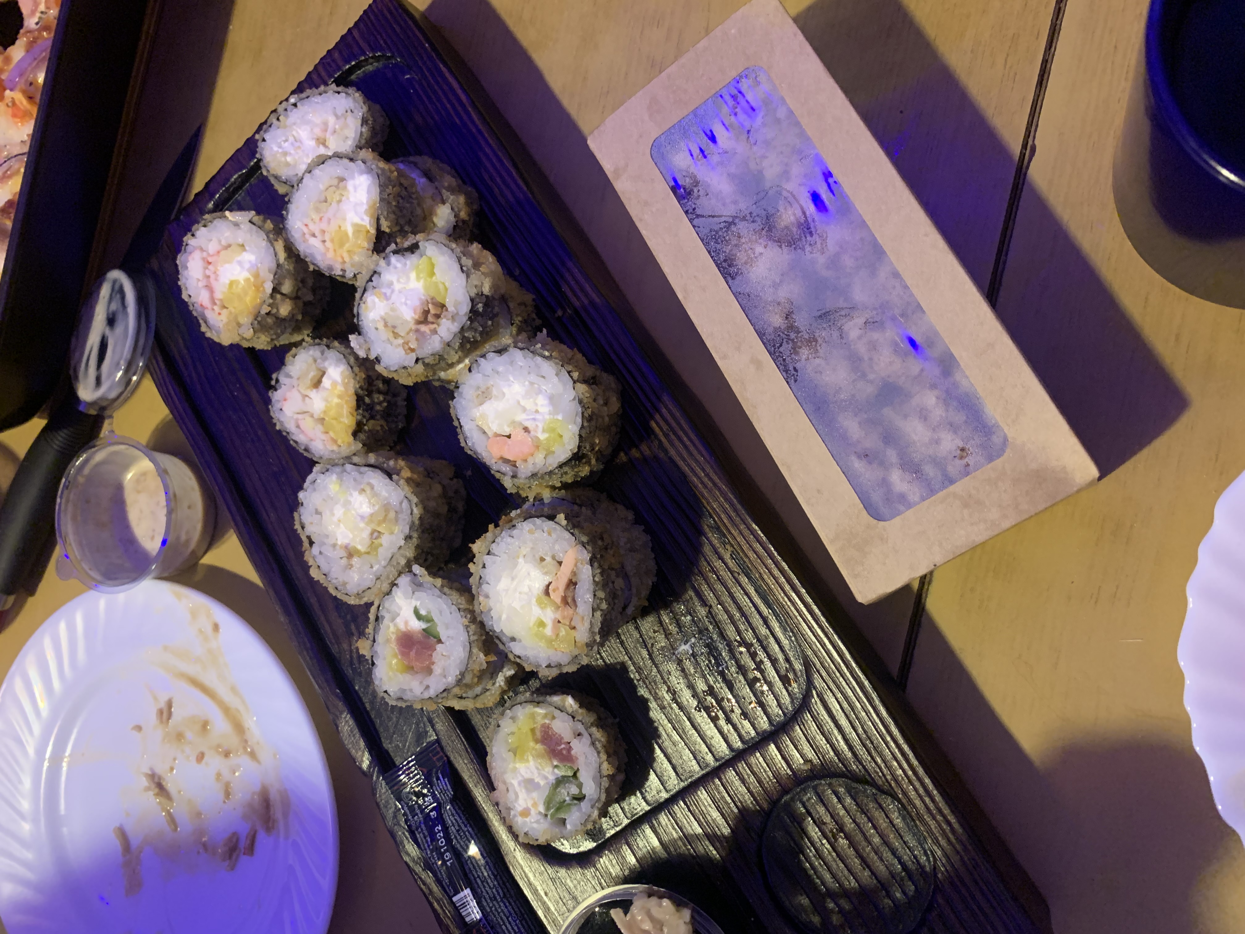 - "Брайтон": филе тунца, сливочный сыр, такуан, огурец, лук зеленый, соус пряный, соус терияки, орехи кешью - 8 шт.
