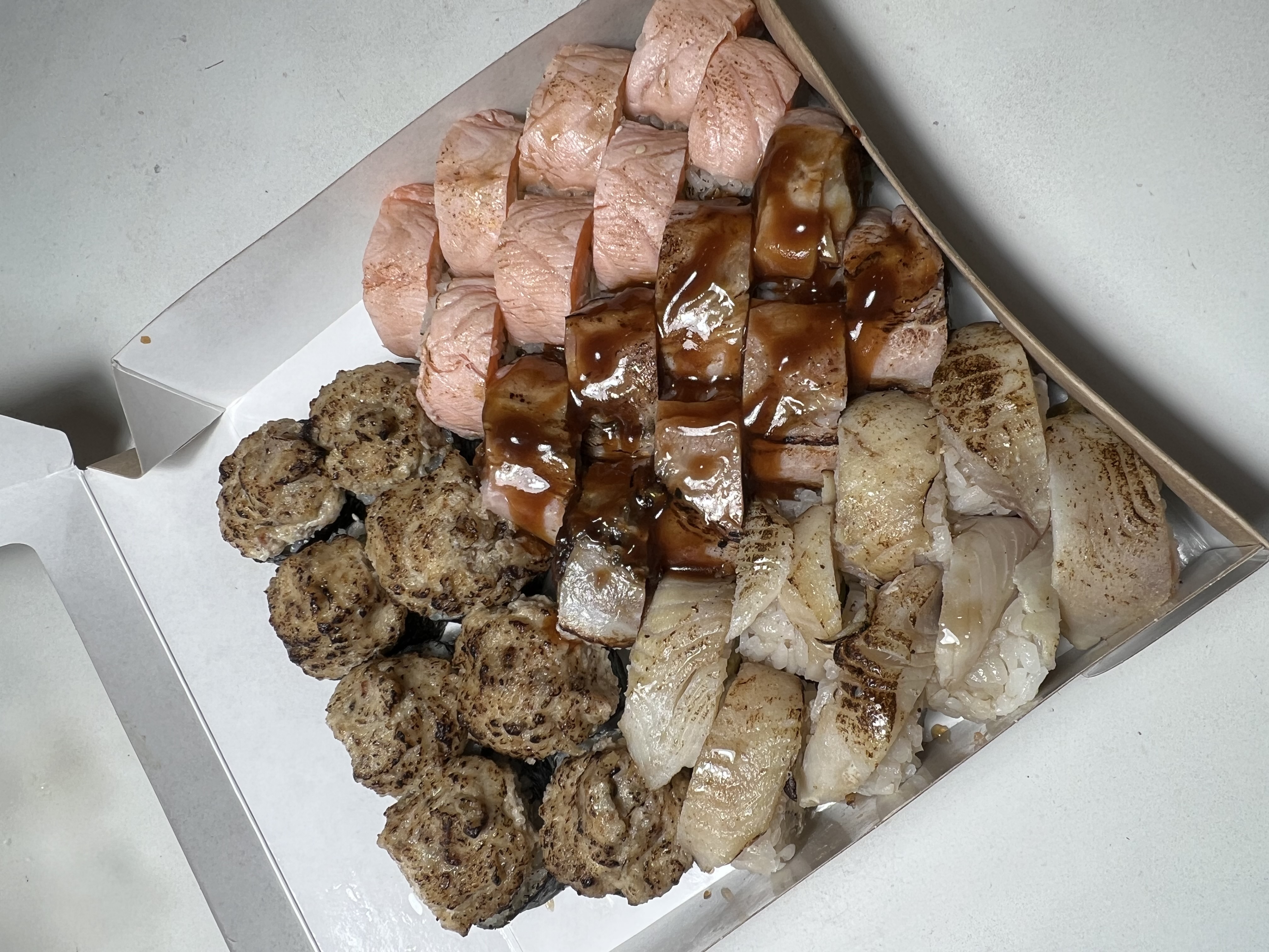 - ролл "Колорадо": жареный лосось в соусе терияки, сыр чеддер, соус сырный, криспи - 8 шт.