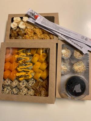 - "Бостон": креветка, сливочный сыр, ананас, салат Айсберг, соус сладко-ореховый, икра Тобико красная. Острое - 8 шт.