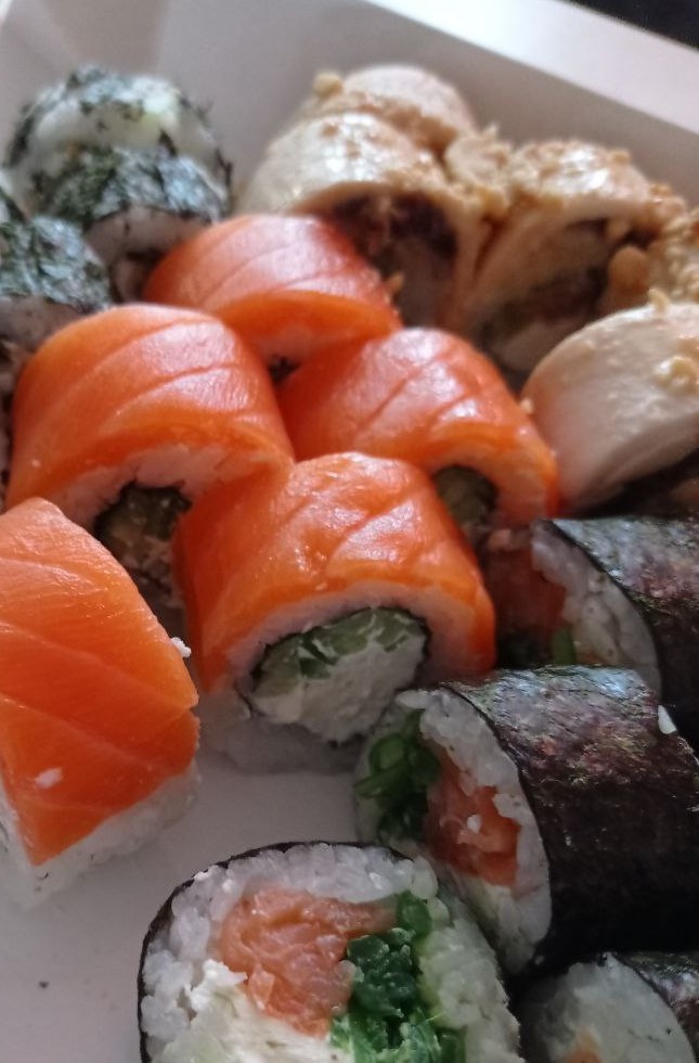 - "Манхеттен": филе лосося, сливочный сыр, авокадо, огурец, кунжут - 8 шт.