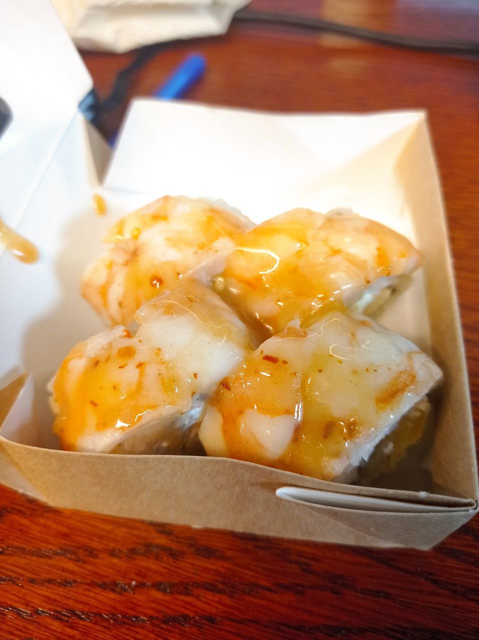 - "Висконсин🌶": креветка, сыр чеддер, пряный соус, соус сладко-ореховый, криспи - 8 шт.