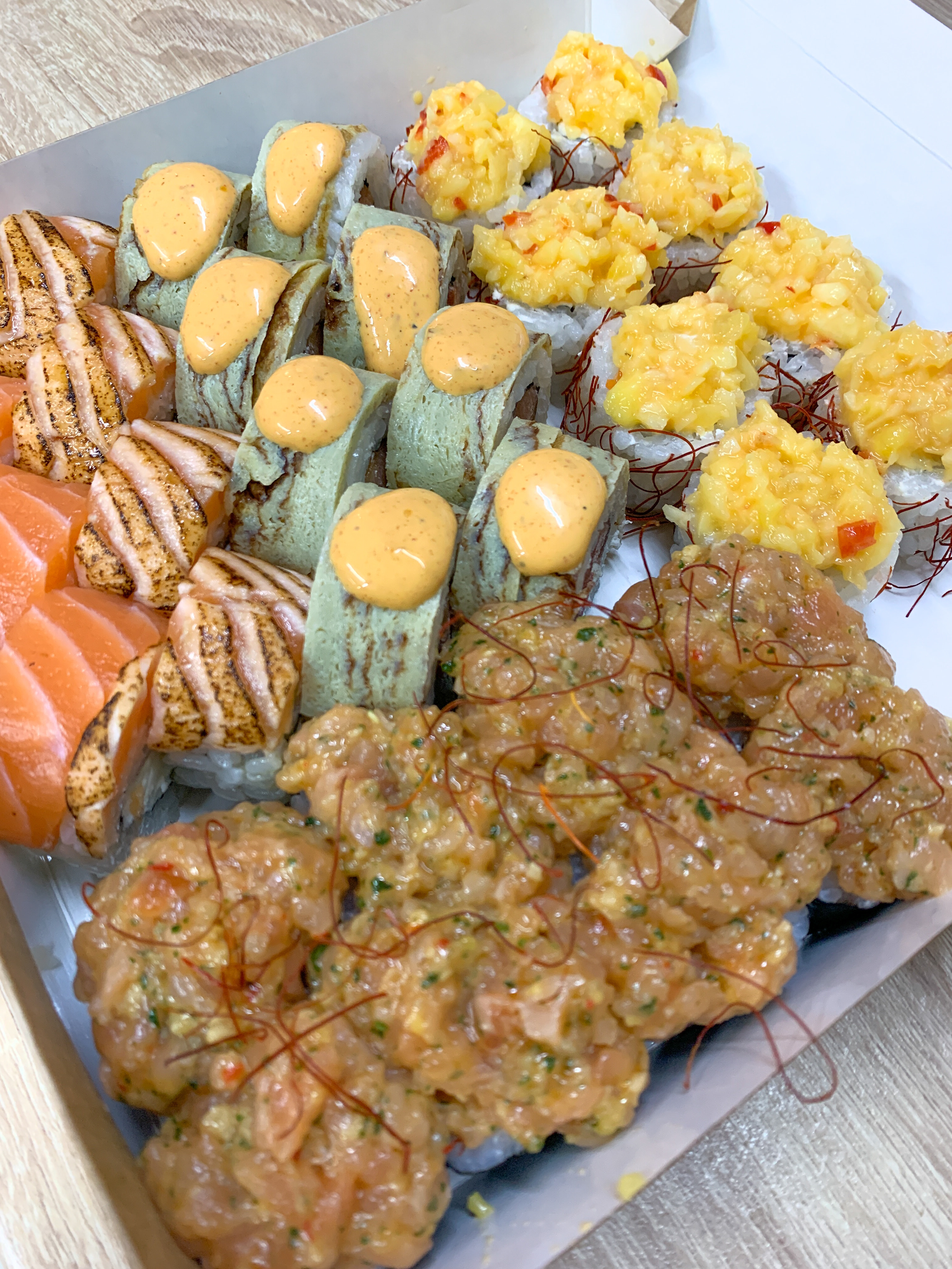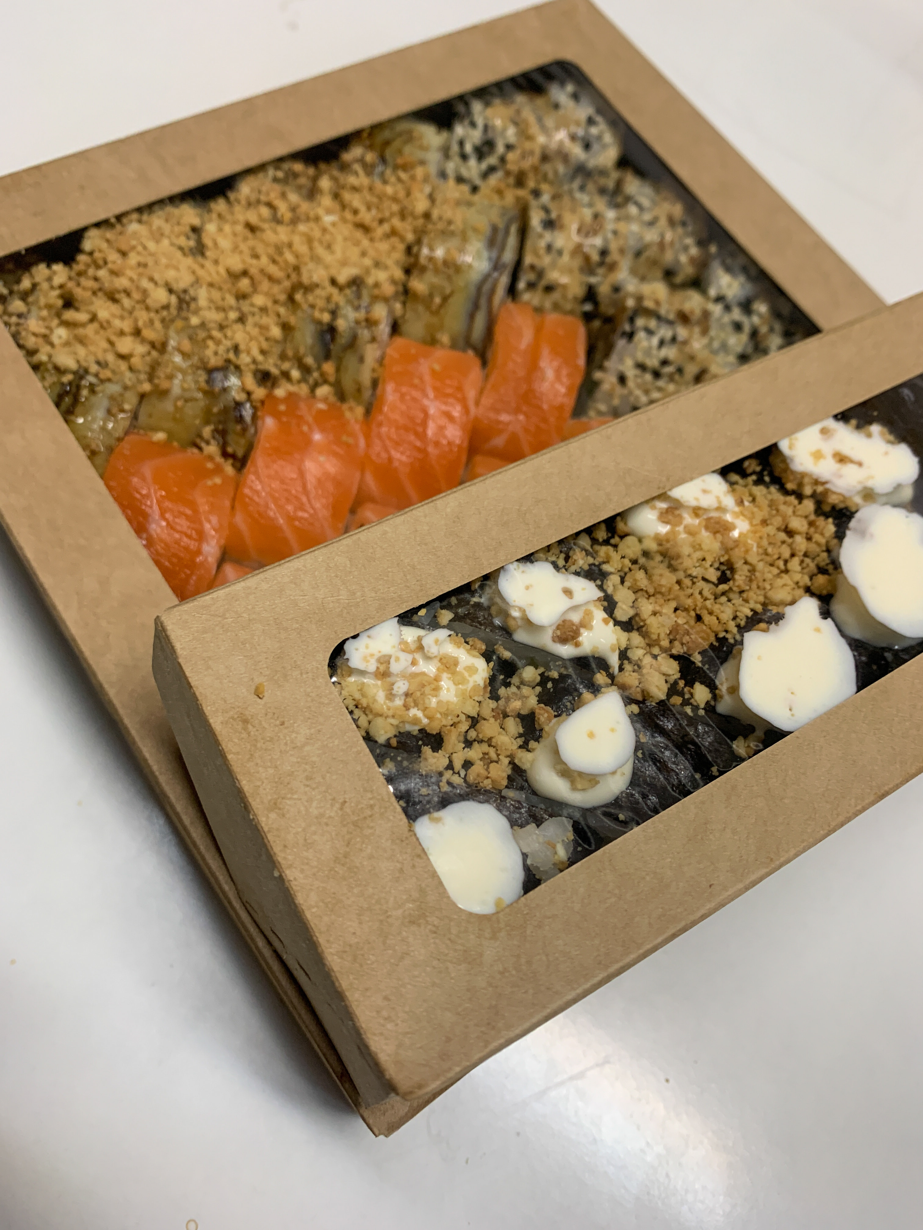 - ролл "Колорадо": жареный лосось в соусе терияки, сыр чеддер, соус сырный, криспи - 8 шт.