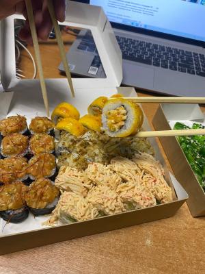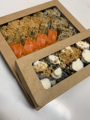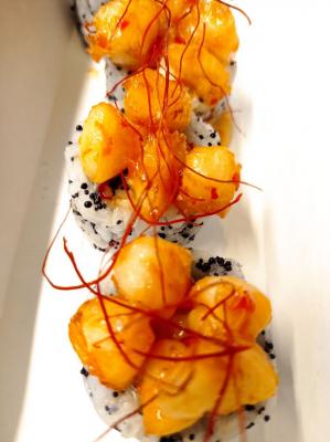 - "Бостон": креветка, сливочный сыр, ананас, салат Айсберг, соус сладко-ореховый, икра Тобико красная. Острое - 8 шт.