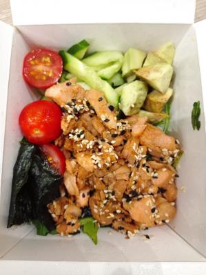- донбури с цыпленком: японский рис, цыпленок, соус терияки, морковь, огурец, омлет тамаго, кунжут, лук-порей