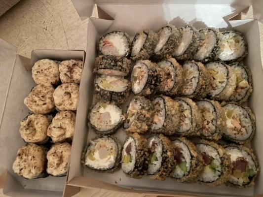 - "Аризона фрай": филе лосося, сливочный сыр, огурец, такуан, панировка - 5 шт.