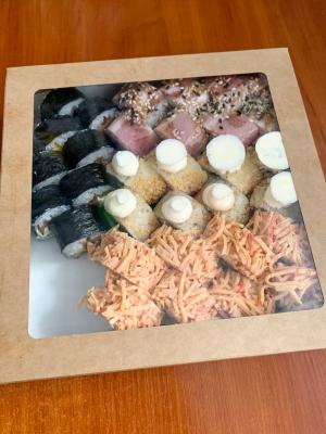 - "Брайтон": филе тунца, сливочный сыр, такуан, огурец, лук зеленый, соус пряный, соус терияки, орехи кешью - 8 шт.